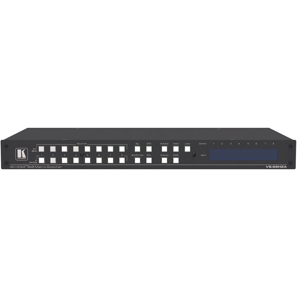 VS-88H2A – матричный коммутатор 8x8 сигналов HDMI с HDCP 2.2, EDID, 3D и ARC и Step-In, поддержка разрешения до 4K/60 (4:4:4). Позволяет подключить любой из входов к любому выходу или к любому набору выходов. Аудиоматрица устройства имеет размерность 24x20 (8 эмбеддированных аудио + 8 ARC + 8 аналоговых входов, 8 цифровых выходов + 4 ARC + 8 аналоговых выходов). Устройство выполняет компенсацию АЧХ кабеля и перетактирование сигнала, восстанавливая его при передаче по длинным линиям с помощью технологии Kramer Equalization & re-Klocking™. Управляется по IP (web-интерфейс) и RS-232.