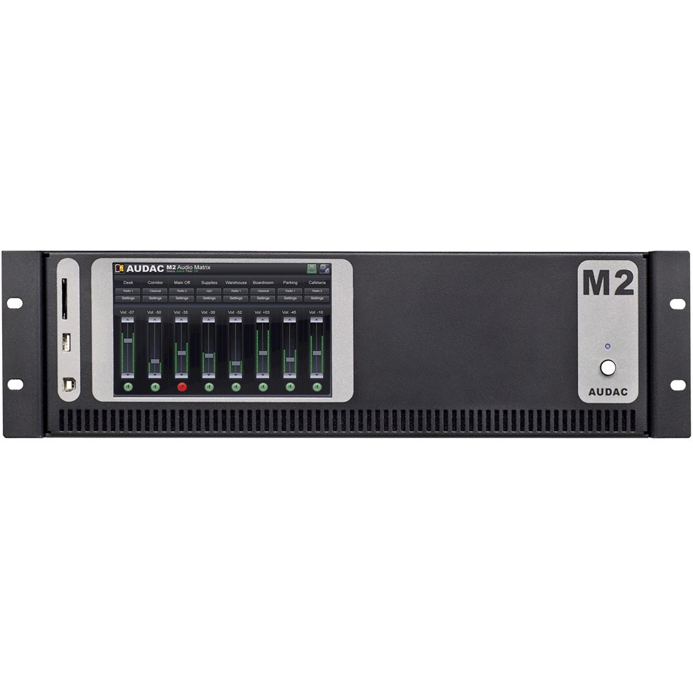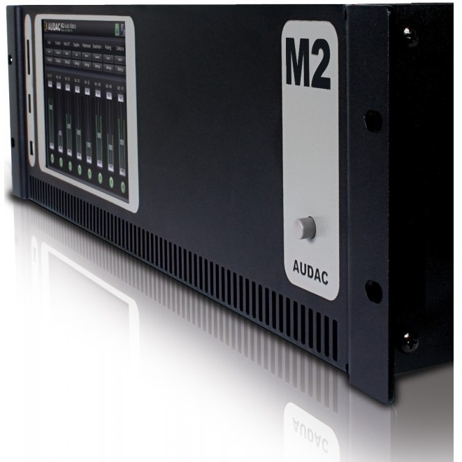 AUDAC M2– матричная микширующая аудиосистема 8х8 балансных стереоаудиосигналов, оборудованная 11-ю цифровыми сигнальными процессорами и поддерживающая большое число способов управления. Встроенный цифровой микшер позволяет совмещать сигналы с разных входных портов и коммутировать их на любые выходные порты. Поддерживается режим воспроизведения экстренных сообщений.
