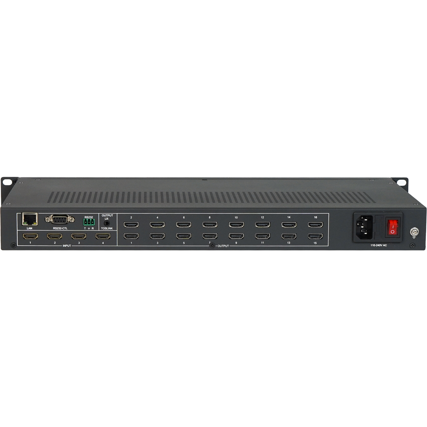 Это бесподрывный матричный коммутатор 4×16 сигналов HDMI 4K с функциями контроллера видеостены и мультивью. Устройство предназначено для передачи видео с 4 источников HDMI на 16 дисплеев.