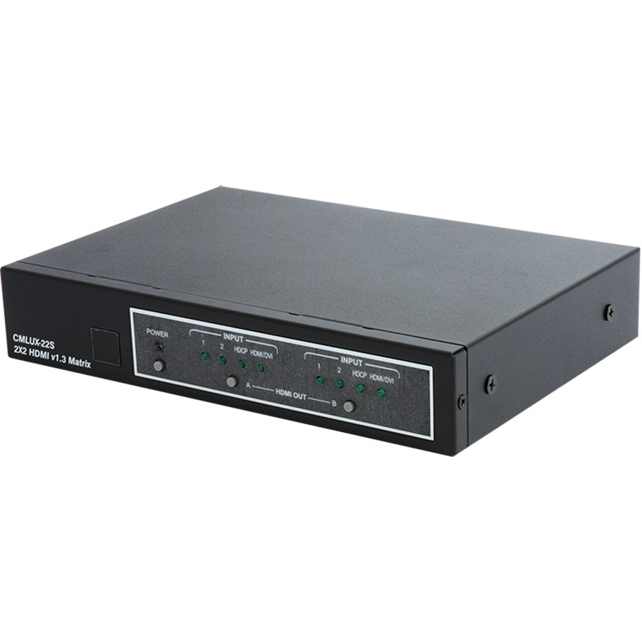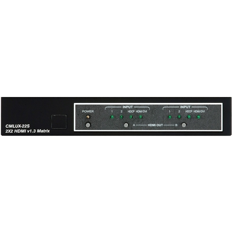 CMLUX-22S – матричный коммутатор 2х2 сигналов интерфейса HDMI 1.3, позволяет осуществлять переключение между 2-мя источниками сигнала в системе с 2-мя устройствами отображения. Сигналы с источников, поданные на два входа, могут быть произвольно направлены на один или два выхода коммутатора.