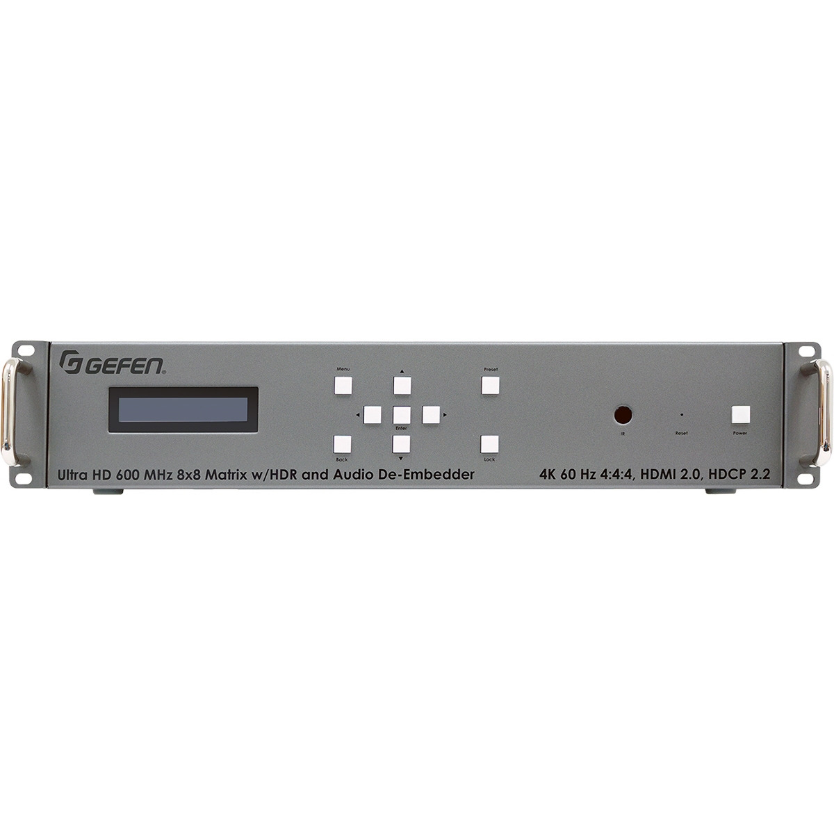 EXT-UHD600A-88 – матричный коммутатор 8х8 сигналов HDMI 2.0 разрешением до 4096x2160/60, 3D (при субдискретизации YUV 4:4:4) с поддержкой технологий HDCP 1.4 и 2.2, EDID и HDR, с полосой пропускания сигналов 600 МГц. Устройство имеет восемь входов и выходов HDMI, для каждого выхода HDMI есть деэмбеддер цифрового аудио формата до 5.1 (разъемы TOSLINK и RCA) и стереоаудио (разъемы miniJack 3,5 мм). Управление устройством осуществляется по ИК, RS-232 и IP (Telnet), а также с помощью ПО Gefen Syner-G.