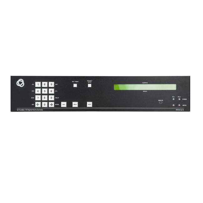 MTX3-16-M/STANDALONE – шасси матричного коммутатора, имеет 8 переназначаемых слотов для модулей ввода / вывода, обеспечивает поддержку разрешений до 4К/60 (4:4:4) с HDCP 2.2, 8K с полосой пропускания 50 Гб/с. Поставляется с двумя блоками питания (один – резервный), имеет модульную быстрозаменяемую систему охлаждения. Коммутация аудио независимая. Управление устройством осуществляется по IP (web-интерфейс и Protocol 3000) и RS-232.