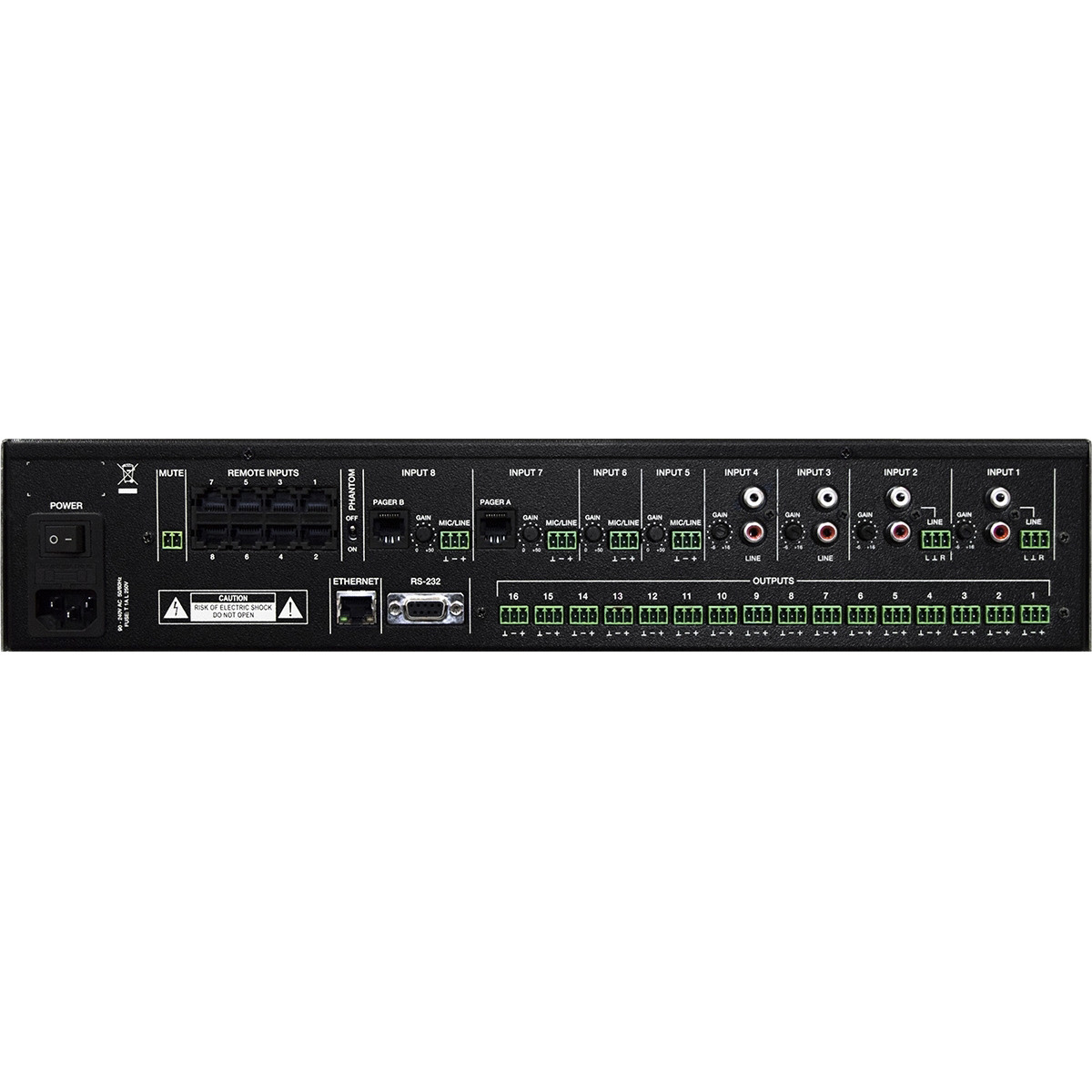 | Входы | 4 – линейный/микрофонный: балансное моно, клеммный блок, 2 – линейный: аудиостерео, клеммный блок, 4 – линейный: аудиостерео, разъемы 2xRCA (розетка), 2 – для пейджингового микрофона, разъем RJ45 (розетка), 8 – для удаленной панели управления, разъем RJ45 (розетка), 1 – замыкаемые контакты mute, клеммный блок |