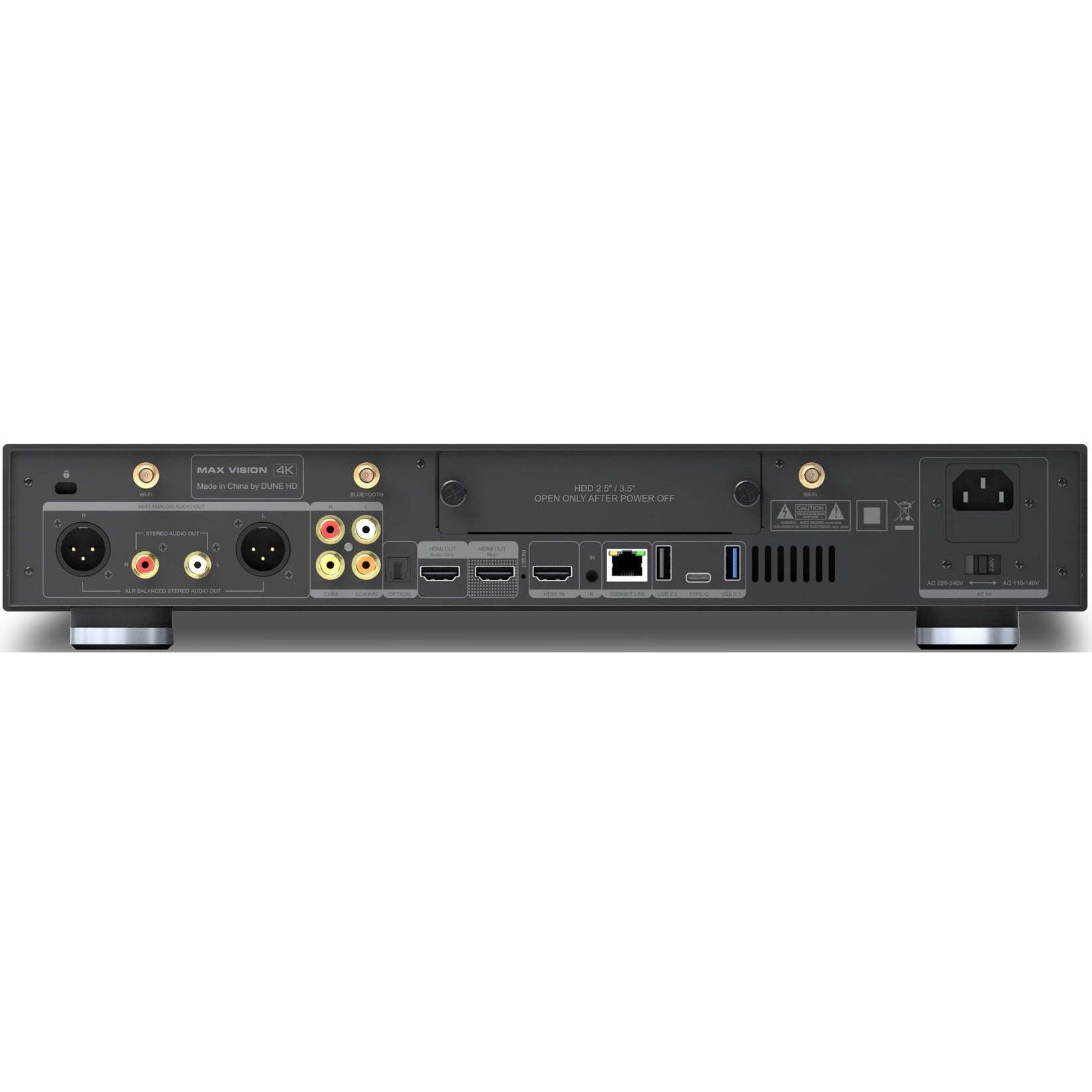 Расширенная коммутация: порт USB Type-C, порт USB 3.0, три порта USB 2.0, HDMI-вход, оптический и коаксиальные S/PDIF аудиовыходы, встроенный Bluetooth 4.х, два HDMI-выхода для вывода изображения и звука в максимальном качестве при использовании 4K ТВ и ресивера без поддержки 4K. Двухдиапазонный Wi-Fi 802.11b/g/n/ac (2.4 GHz + 5.0 GHz) для передачи высокобитрейтного контента "по воздуху", порт Ethernet 1Gbit для максимальной производительности при проводном подключении. Дополнительные порты для профессиональных инсталляций: ИК-порты (вход, выход), RS-232 порт.