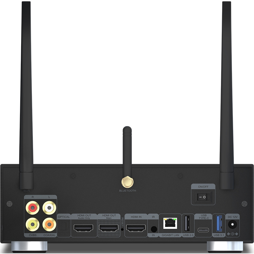 Порт USB Type-C, порт USB 3.1, два порта USB 2.0, оптический S/PDIF аудиовыход, коаксиальный S/PDIF аудиовыход, дополнительный HDMI-выход для вывода звука, HDMI-вход, ИК-вход. Медиаплеер поставляется сразу с двумя пультами дистанционного управления - большой ИК-пульт с функцией обучения и дополнительный Bluetooth-пульт с функцией AirMouse (аэромышь) и микрофоном.
