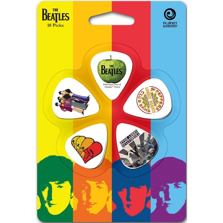 10 толстых коллекционных медиаторов Beatles с изображениями с альбомов «Rubber Soul», «Sgt. Peppers», «Abbey Road» и других.