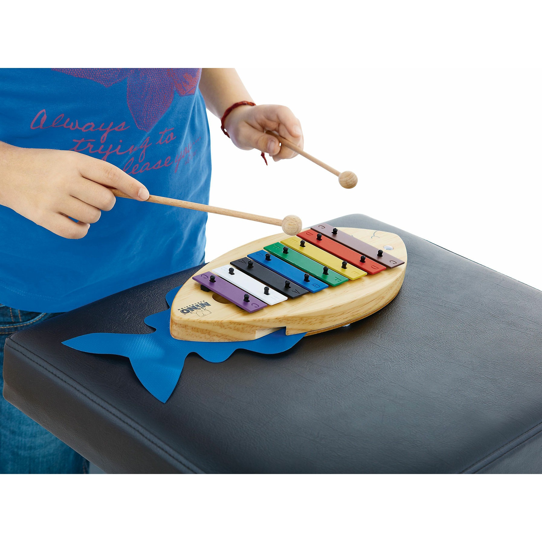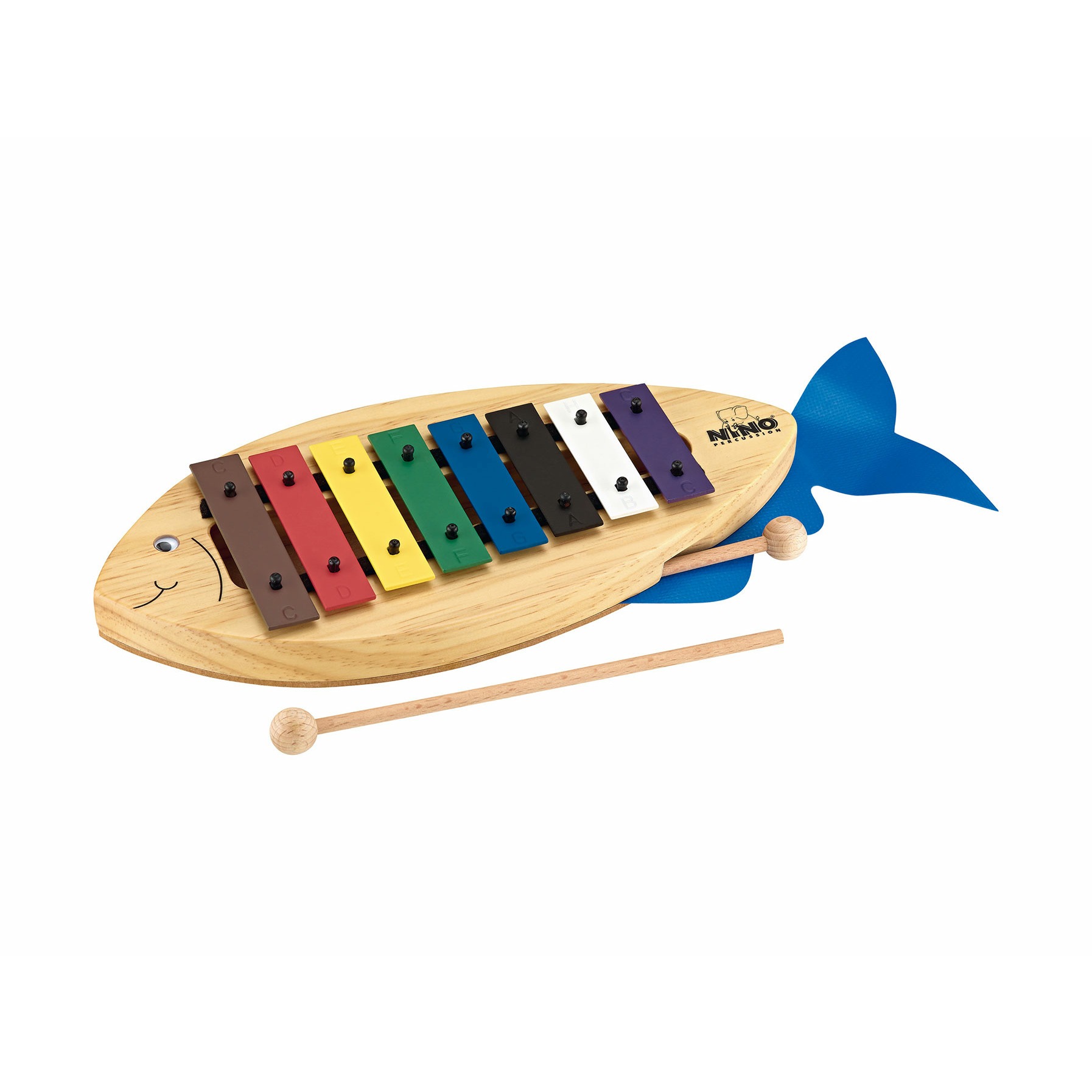 Металлофон Nino Percussion Glockenspiel - это идеальный инструмент для начала ознакомления детей с миром музыки. Металлофон в форме рыбки имеет разноцветные клавиши настроенные по шкале c, d, e, f, g, a, b, c. Благодаря тому что клавиши могут легко удаляться с металлофона, есть возможность вначале ознакомления с инструментом, немного упростить его и далее по мере приобретения навыков и большей уверенности в игре, добавлять клавиши обратно расширяя звуковой диапазон. Интересный дизайн делает данный металлофон очень занимательным и весёлым в использовании.