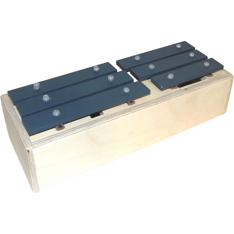 Пластины расположены по возрастанию и убыванию высоты, аналогично щелевому ксилофону (барабану).