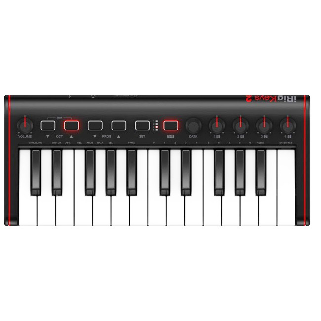 Разнообразие органов управления в iRig Keys 2 велико: выходная громкость, клавиши переключения октав и программ, кнопка установки и энкодер данных.