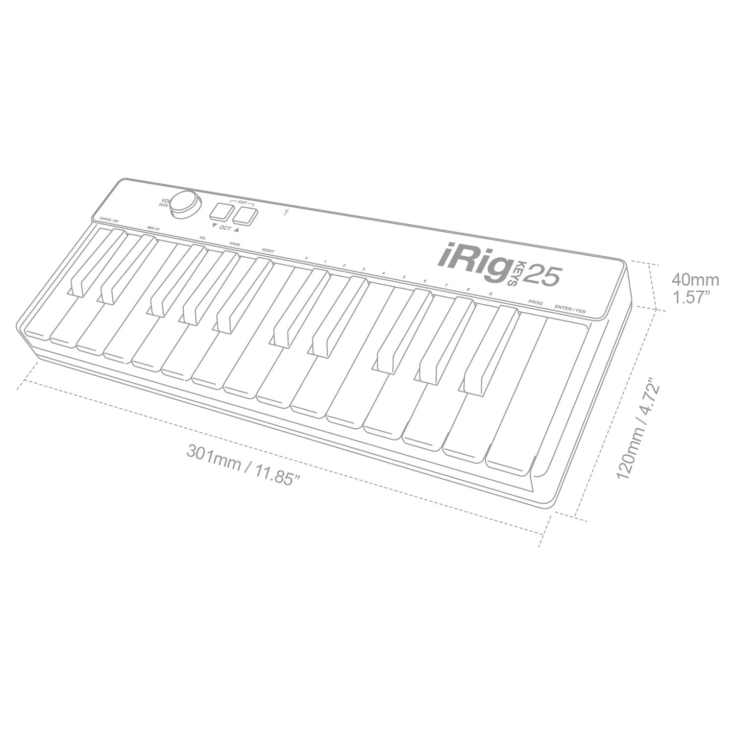 IK MULTIMEDIA iRig Keys 25 – современный многофункциональный миди-контроллер от итальянского производителя IK Multimedia для компьютеров и ноутбуков под управлением Mac OS и Windows. Модель отличается удобством использования и универсальностью. Для подключения к компьютеру имеется кабель USB. Плоский компактный корпус и небольшой вес позволяют легко перевозить iRig Keys 25 с собой, использовать в любое время и в любом месте. Мобильность iRig Keys 25 увеличивает также минимальное потребление энергии и возможность электропитания непосредственно от устройства, к которому подключен контроллер. Модель оснащена 25 мини-клавишами, чувствительными к скорости нажатия. Две полные октавы плюс одна клавиша – и при этом устройство легко поместится в сумку или рюкзак. Для эффективной работы с контроллером в комплект поставке включено бесплатное программное обеспечение для компьютера SampleTank.