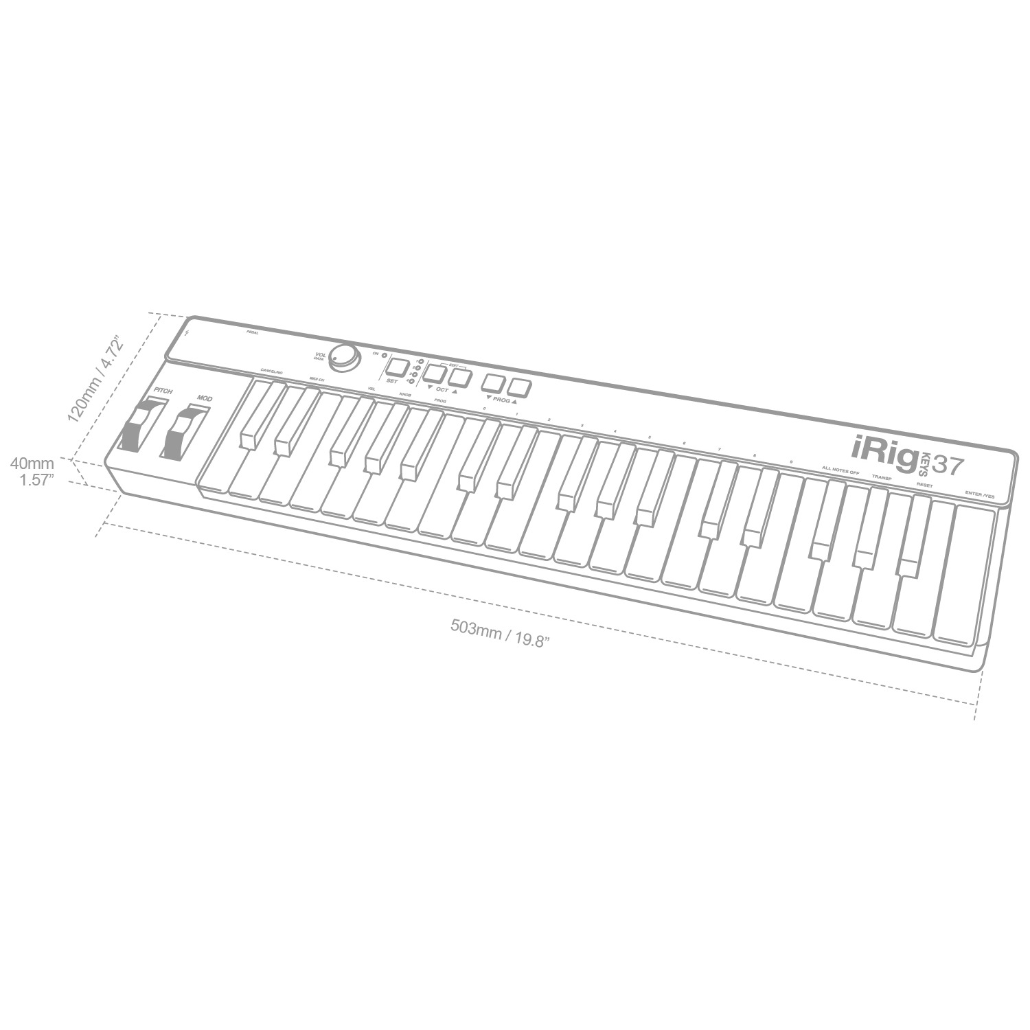 IK MULTIMEDIA iRig Keys 37 – современный многофункциональный миди-контроллер от итальянского производителя IK Multimedia для компьютеров и ноутбуков под управлением Mac OS и Windows. Модель отличается удобством использования и универсальностью. Для настройки звучания имеются регуляторы модуляции и высоты тона. Для подключения к компьютеру имеется кабель USB. Плоский компактный корпус и небольшой вес позволяют легко перевозить iRig Keys 37 с собой, использовать в любое время и в любом месте. Мобильность iRig Keys 37 увеличивает также минимальное потребление энергии и возможность электропитания непосредственно от устройства, к которому подключен контроллер. Модель оснащена 37 мини-клавишами, чувствительными к скорости нажатия. Три полные октавы плюс одна клавиша – и при этом устройство легко поместится в сумку или рюкзак. Для эффективной работы с контроллером в комплект поставке включено бесплатное программное обеспечение для компьютера SampleTank. Также возможно использование опциональной педали сустейна или экспрессии.