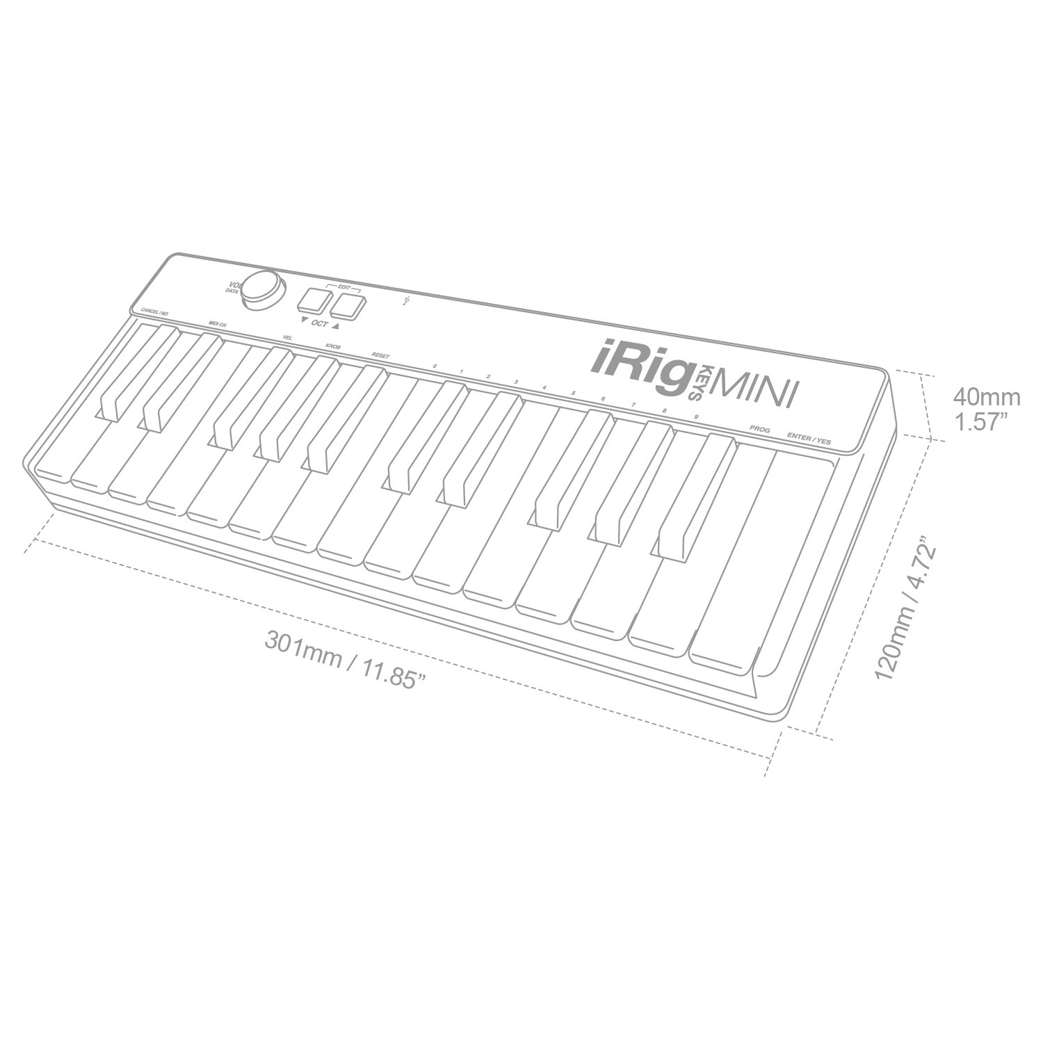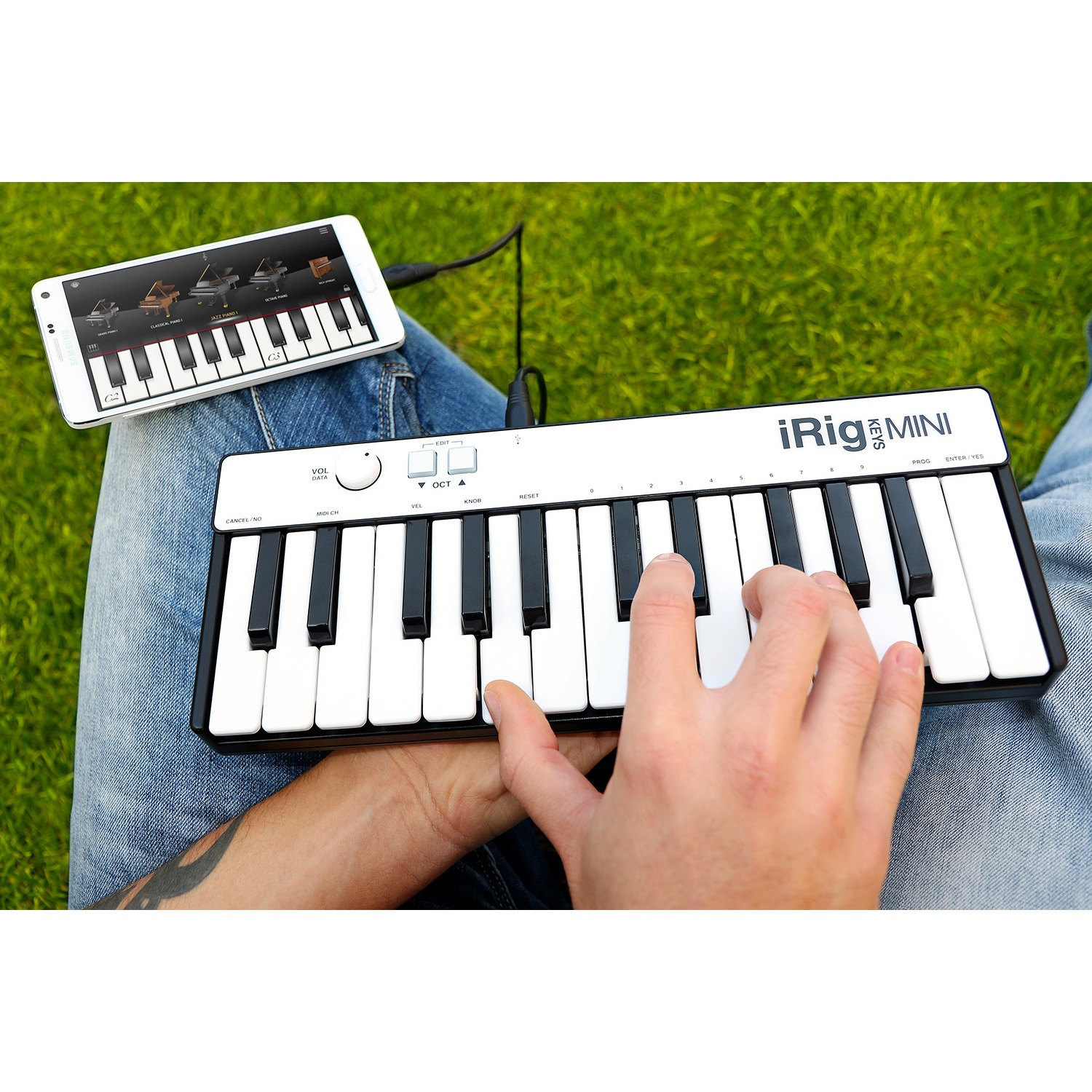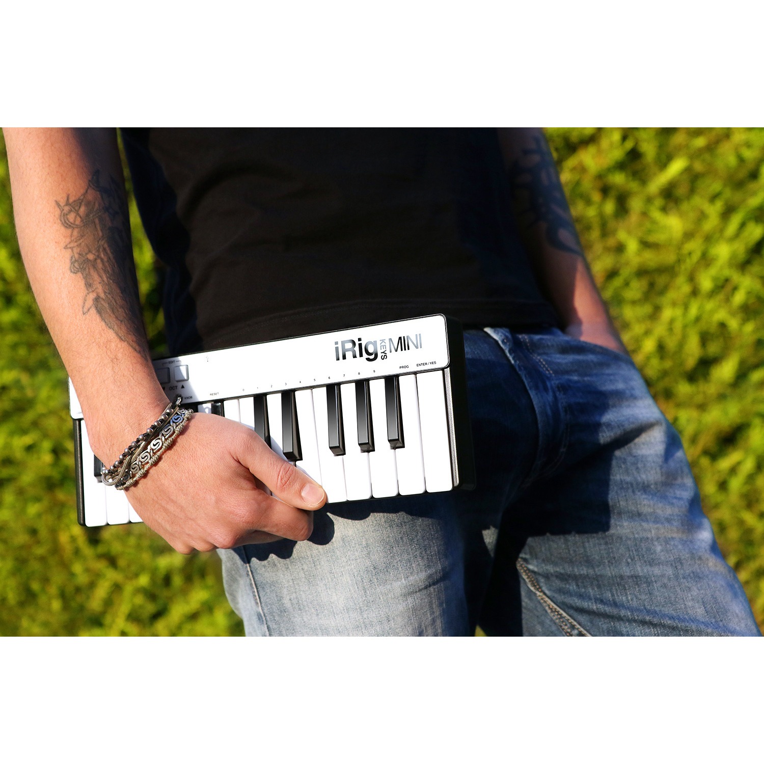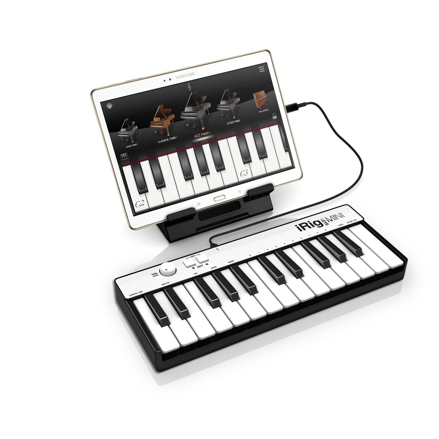 IK MULTIMEDIA iRig Keys Mini – современный многофункциональный миди-контроллер от итальянского производителя IK Multimedia, оптимизированный для использования с мобильными устройствами под управлением iOS и Android, в том числе iPhone, iPad, iPod touch, а также компьютерам и ноутбукам под управлением Mac OS и Windows. Модель отличается удобством использования и универсальностью. Для подключения к устройствам iOS используется коннектор Lightning, для устройств на базе Android в комплект поставки включен кабель OTG/Micro-USB, для подключения к компьютеру имеется кабель USB. Плоский компактный корпус и небольшой вес позволяют легко перевозить iRig Keys Mini с собой, использовать в любое время и в любом месте. Мобильность iRig Keys Mini увеличивает также минимальное потребление энергии и возможность электропитания непосредственно от устройства, к которому подключен контроллер. Модель оснащена 25 мини-клавишами, чувствительными к скорости нажатия. Две полные октавы плюс одна клавиша – и при этом устройство легко поместится в сумку или рюкзак. Для эффективной работы с контроллером в комплект поставке включено бесплатное программное обеспечение для компьютера и приложения для мобильных устройств: iGrand Piano, iLectric Piano, SampleTank, iGrand Piano).