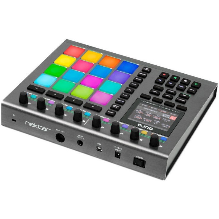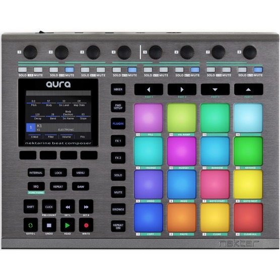 Nektar Aura - USB/MIDI контроллер, цветной TFT-дисплей, 16 чувствительных к скорости и давлению RGB-пэдов, 8 кнопок Nektarine, 8 потенциометров, 7 транспортных кнопок, обширные возможности редактирования, внутренняя память для пресетов.