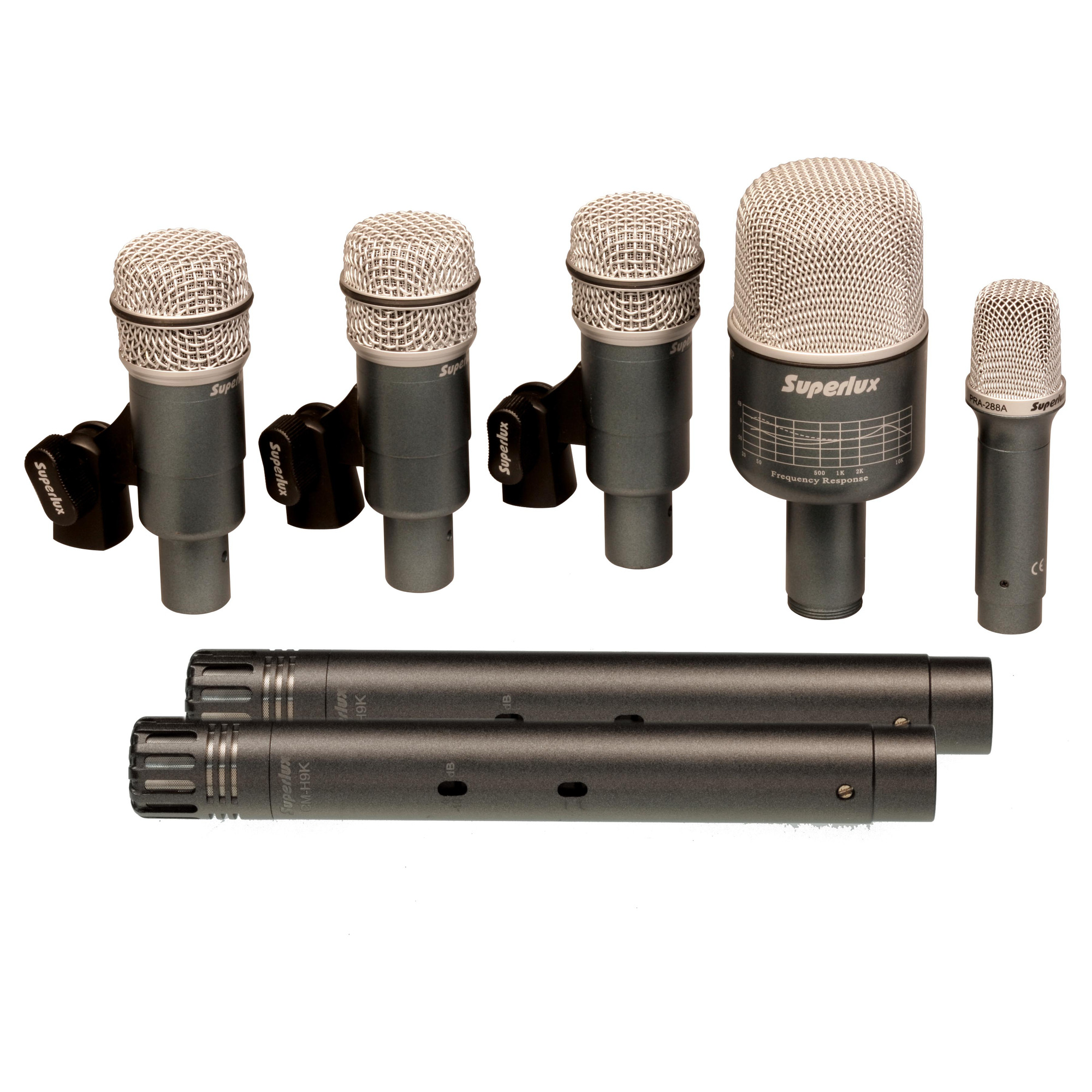SUPERLUX DRK B5C2 MKII - качественный набор микрофонов для подзвучивания и записи барабанов. Микрофоны из этого комплекта имеют высокий УЗД, разработанный с учетом уникальности каждой ударной установки, и способны передать всю глубину и все краски звучания барабанов разных брендов и диаметров. В комплект входит 7 устройств: динамический микрофон PRO218A для бас-барабана, три динамических PRO228A для тома, два конденсаторных PRO268B для тарелок/оверхед и PRA288A для малого барабана. Для хранения и транспортировки есть удобный пластиковый кейс. В дополнении к качественному звуку микрофонов серии PRO, прилагается интегральный монтаж, для оптимального размещения микрофонов.