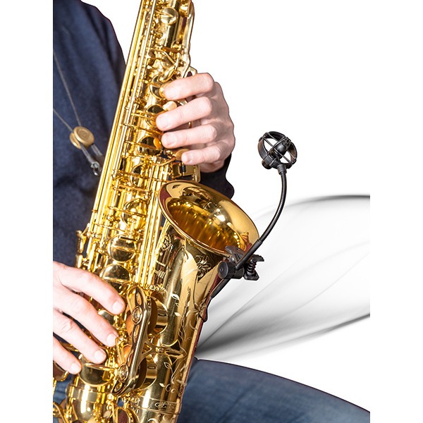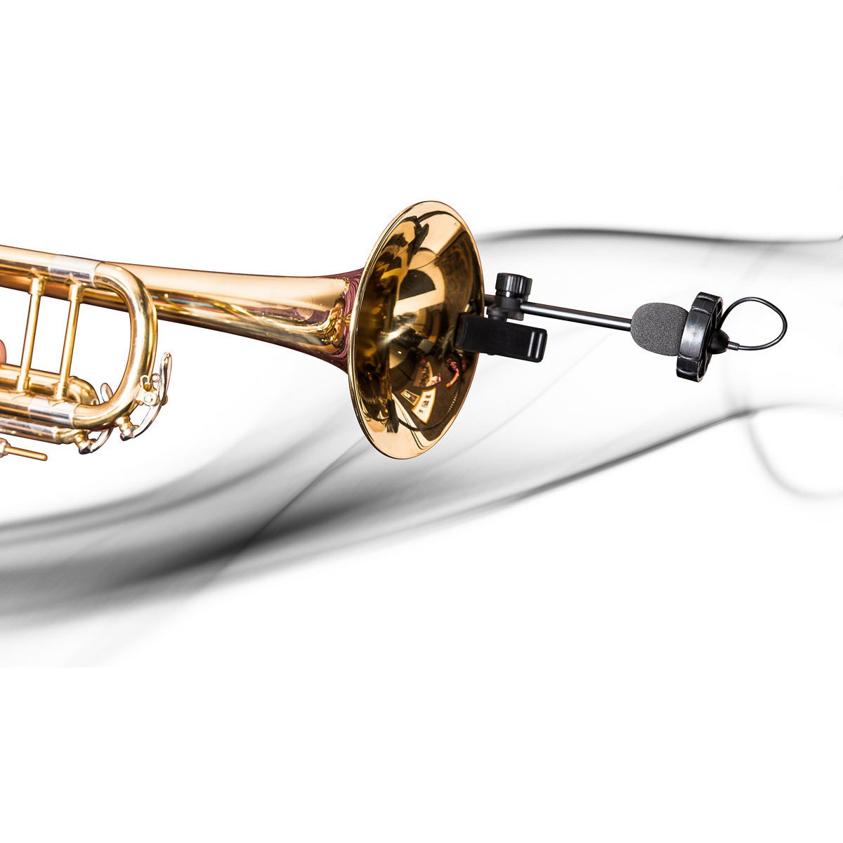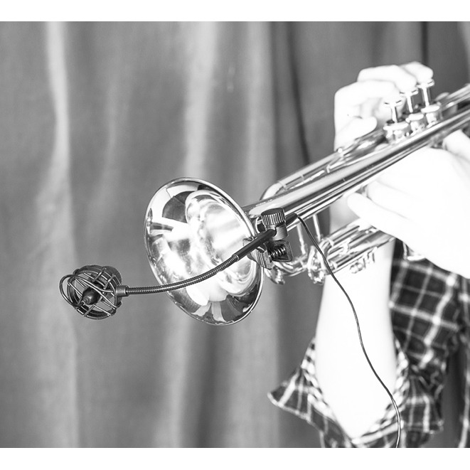 Затем был создан держатель микрофона, состоящий из фиксированного и гибкого компонентов. Это обеспечивает большую гибкость и стабильность. Система подвески снижает шум от нажатия клапанов, а зажим специально адаптирован для плотного прилегания к раструбу инструмента.