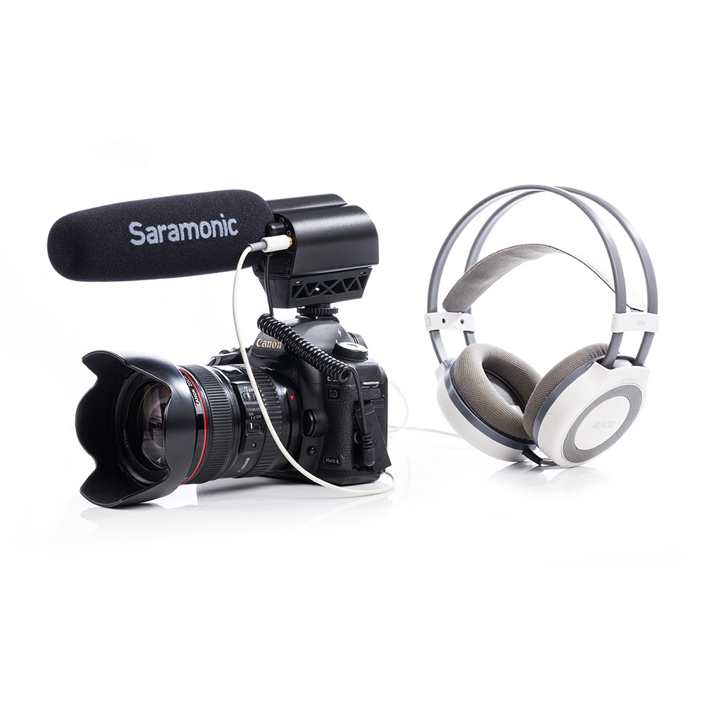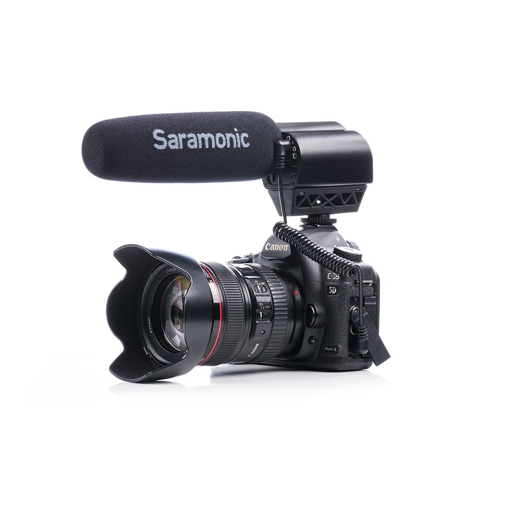 Saramonic Vmic Pro - это супер направленный видеоконденсаторный микрофон, который обеспечивает профессиональный звук для камер и видеокамер DSLR. Vmic Pro позволяет настроить уровень управления (-10 дБ, 0 дБ, + 20 дБ), фильтр верхних частот (150 Гц) и высокочастотный импульс (+ 6 дБ) для повышения разборчивости диалога. Съемный 3,5-миллиметровый кабель соединяет Vmic Pro с аудиовходом вашей камеры, а выход стереонаушников позволяет контролировать входящий звук.