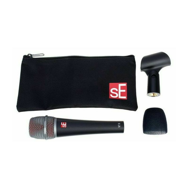 В комплекте sE Electronics V7 X также поставляются зажим для микрофонной стойки с адаптером, чехол для переноски и хранения, вышеупомянутая чёрного цвета ветрозащита, инструкция пользователя и стикер с логотипом sE.
