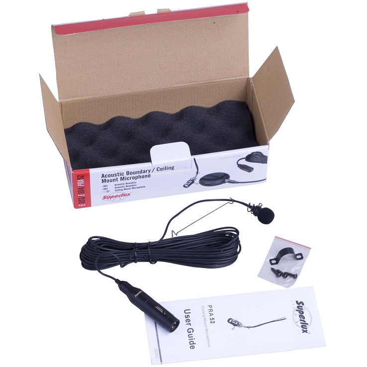 Миниатюрный конденсаторный микрофон Superlux PRA52B c системой подвеса подойдет для потолочных инсталляций. Кабель длиною 10 метров в комплекте и специальная система подвеса позволяют использовать устройство в тех случаях, когда микрофон не должен быть заметен.