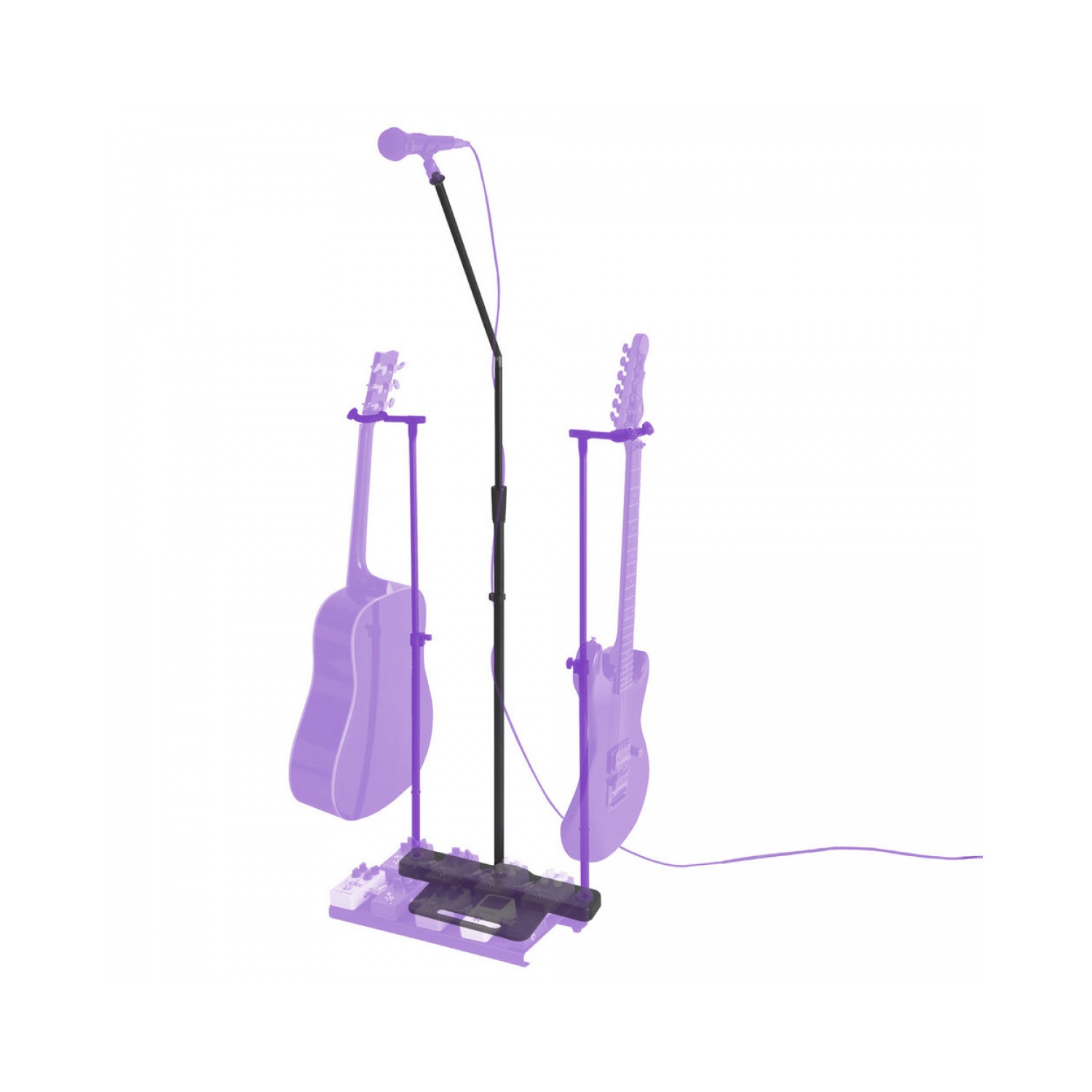 Прямоугольная форма основания обеспечивает устанавку гитарных пелалей вплотную к стойке. Все металлические внешние части окрашены в черный цвет. Основание имеет шесть резиновых ножек.