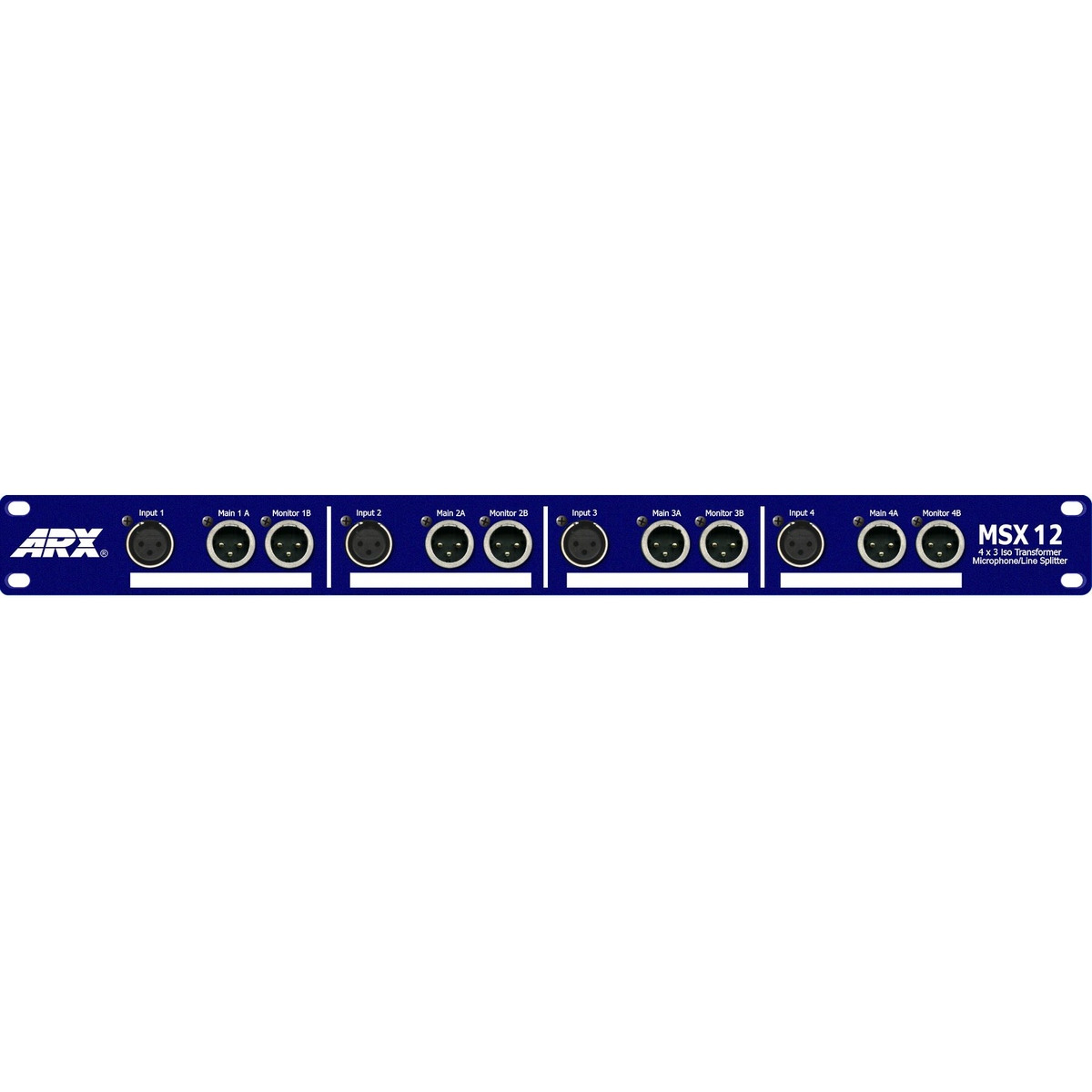 Пассивный четырехканальный трансформаторный микрофонный/линейный сплиттер MSX12 имеет на каждом канале микрофонный/линейный вход (XLR), три выхода (XLR, два на передней панели), место для надписи. Поддерживается сквозное фантомное питание. Есть терминал для заземления.