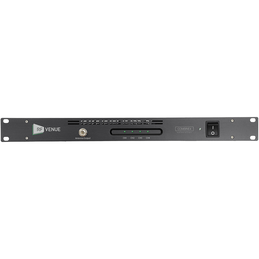 Shure RF VENUE RFV-COMBINE4E – профессиональный комбайнер для систем персонального мониторинга, который позволяет принять сигналы сразу от нескольких (до четырёх) передатчиков. Антенна, на которую направляются сигналы с передатчиков, присоединяется к выходу BNC на передней панели устройства. Сзади расположены четыре входных разъема BNC для подключения передатчиков. COMBINE4 можно применять с системами персонального мониторинга любых производителей, можно также подключать направленные антенны любых типов. Рекомендуется использование с комбайнером направленной спиральной антенны RF VENUE CP Beam™. Кроме того, устройство служит источником питания для четырёх передатчиков, что позволяет упростить коммутацию, избежать излишнего количества проводов, минимизировать требуемое количество розеток. COMBINE4 позволяет оптимизировать многоканальные системы, уменьшить количество используемых передатчиков и таким образом предотвратить возникновение интерференции. Диапазон рабочих радиочастот комбайнера – от 470 до 960 МГц.