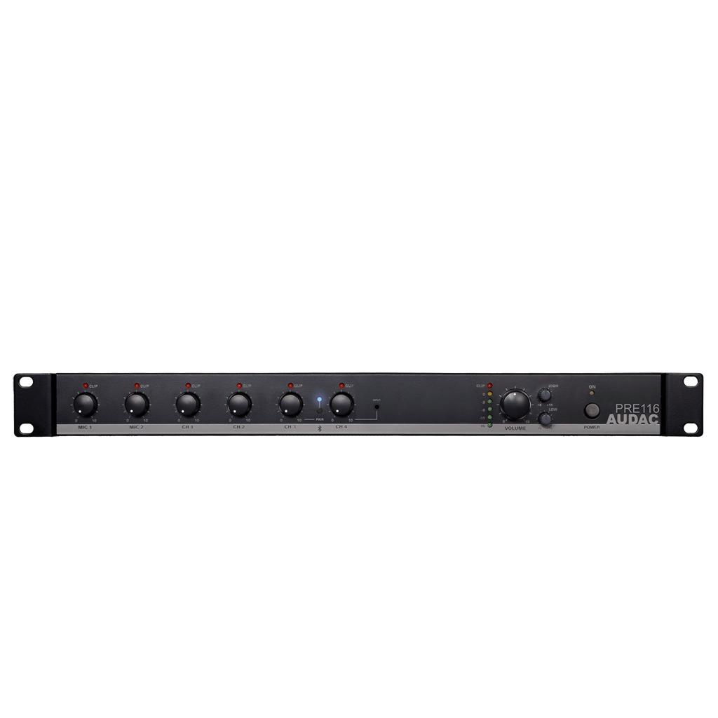 Audac PRE116 - простой в использовании, но функционально мощный 6-канальный стереофонический предусилитель высотой 1U, монтируемый в 19'' стойку. В дополнение к стандартным входам, оснащен приемником Bluetooth (канал 3) и дополнительным входом стереоаудио miniJack 3,5 мм (канал 4). Устройство имеет переключатель выходного сигнала моно/стерео и возможность удаленного мьютирования. Подходит для широкого диапазона различных приложений.