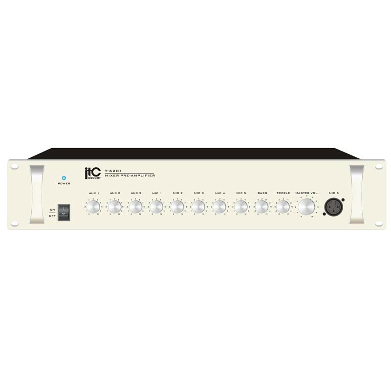 Предварительный усилитель ITC ESCORT T-6201 входит в состав системы оповещения ITC-ESCORT и используется для построения систем автоматического аварийного оповещения и музыкальной трансляции на базе дополнительного оборудования. Данный блок предназначен для предварительного усиления звукового сигнала от музыкальных источников. К данному блоку может быть подключено до 5-ти источников аудио сигнала, 2 из которых приоритетные. К блоку ITC ESCORT T-6201 также можно подключить до 5-ти микрофонов, один из которых имеет приоритет над другими микрофонами и аудио источниками. Уровни линейных и микрофонных входов регулируются при помощи ручек на передней панели. Самый высокий приоритет в данном блоке имеют аварийные входы (EMC) на задней панели. При подаче на эти входы аудио сигнала (например: от аварийного источника) он поступает на выход, приглушая сигналы со всех входов. Питание блока ITC ESCORT T-6201 осуществляется от переменного напряжения 220В. Конструктивно ITC ESCORT T-6201 выполнен в рэковом 19-дюймовом корпусе, предназначенном для монтажа в стандартный электротехнический шкаф.