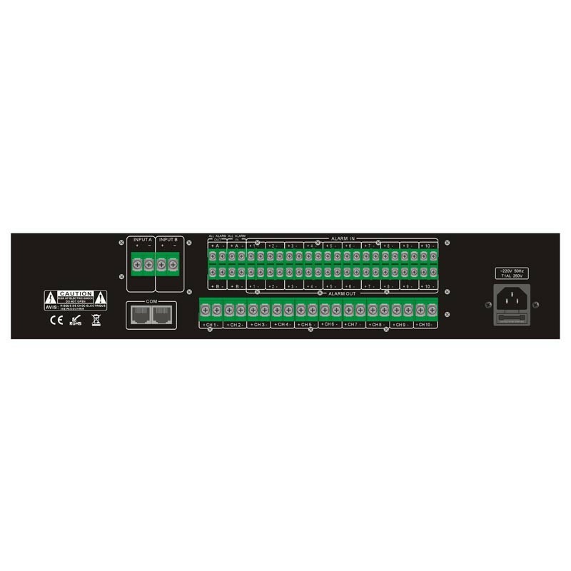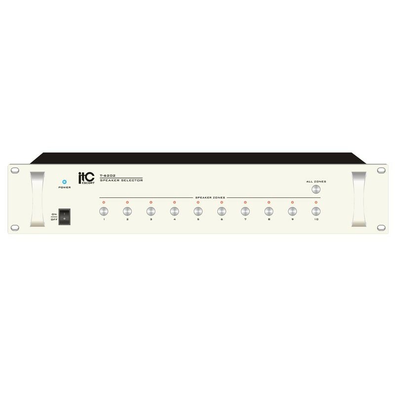 Селектор зон ITC ESCORT T-6202 входит в состав системы оповещения ITC-ESCORT и используется для построения систем автоматического аварийного оповещения и музыкальной трансляции на базе дополнительного оборудования. Данный блок предназначен для коммутации (подключения) 100В выходов усилителей к нужной линии громкоговорителей. К входу данного блока может быть подключено до 2-х усилителей мощности. Мощность каждого усилителя не должна превышать 1500Вт. К выходу данного блока может быть подключено до 10-ти линий громкоговорителей, мощность каждой из которых не должна превышать 500Вт.