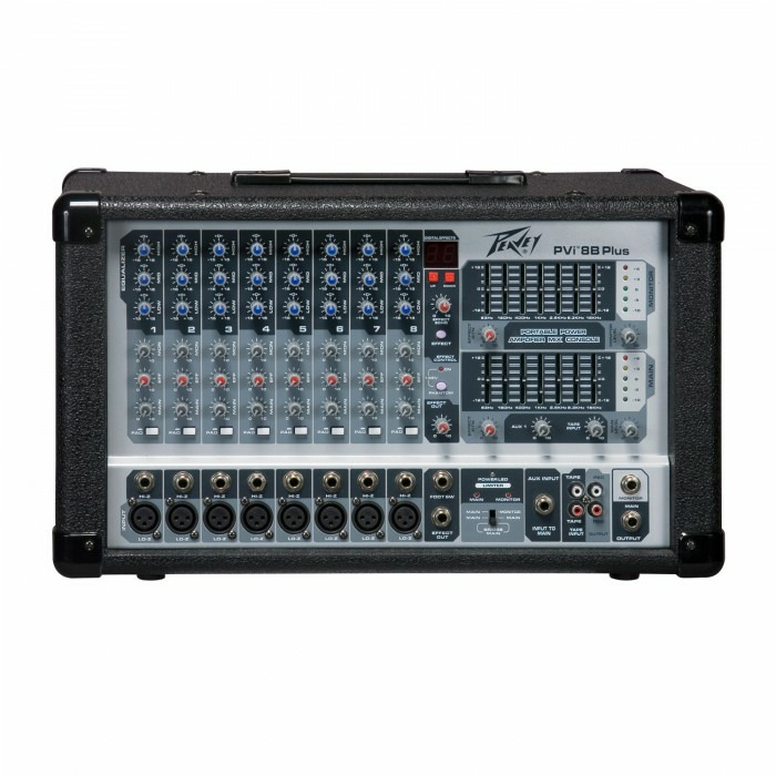 Peavey PVi 8B Plus - это универсальный активный микшерный пульт с прочным корпусом и надёжной секцией усиления. Микшер отличается от PVi 8B добавленным DSP-процессором, двумя 7-полосными графическими эквалайзерами для мониторной и мастер-секций, а мощность встроенного усилителя теперь составляет 350 Вт.