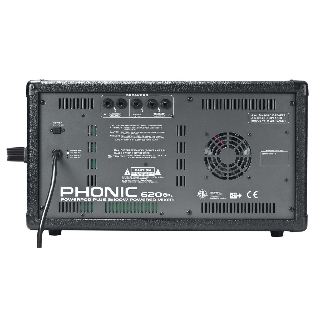 Phonic POWERPOD 620 PLUS T1 - имеет выходной 7-ми полосный эквалайзер, два 100-ваттных усилителя мощности. Входов столько же, сколько в POWERPOD615 - 6 симметричных и 8 линейных. Аппарат имеет шесть линеек, каждая из которых оснащена 2-х полосным эквалайзером, регулятором подачи сигнала в мониторы, регулятором уровня сигнала эффекта и регулятором уровня громкости. Линейки с первой по четвёртую имеют кнопку PAD. Входы расположены на лицевой стороне и выполнены на разъёмах TRS и XLR. К аппарату возможно подключение внешнего записывающего устройства через разъёмы RCA Микшер снабжён эффектом Delay с регуляторами Time и Repeat. Под этим блоком находится регулятор уровня сигнала, подающегося в мастер-шину. Мониторная шина имеет регулятор уровня сигнала эффекта и регулятор громкости. Мастер-шина имеет регуляторы уровня сигнала внешнего записывающего устройства, линейного входа и громкости.