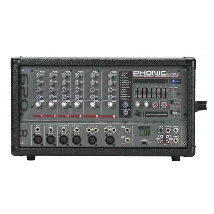 Активный микшер Powerpod 620 R от Phonic - это универсальный передовой PA микшер, выполненный в компактном, прочном, литом корпусе. Каждый Powerpod Plus 1062 R имеет встроенный стерео усилитель с мостовым режимом работы и возможностью коммутирования нагрузки. Входы super Hi-Z позволяют подключать гитары и другие инструменты. Также в микшер установлен USB рекордер, позволяющий записывать основной микс на любой стандартный USB накопитель. Устройства также предлагают Вам цифровые эффекты высокой четкости с 16 предустановленными программами и пользовательским контролем параметров. Трёхполосный эквалайзер на каждом канале и двойной многополосный графический эквалайзер с возможностью выбора IN/OUT режимов дают Вам максимальный контроль над Вашим миксом.