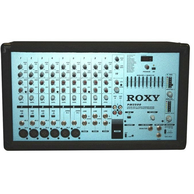Roxy PM2500 активный микшер 2х250 Вт усилитель мощности для главного входа/выхода монитора или главного 1/главного 2 выхода (мостовой моно, 500 Вт/8 Ом), 32/40-бит цифровой стерео процессор эффектов, 100 программ, выходной 10-полосный эквалайзер, 6 симмет.
