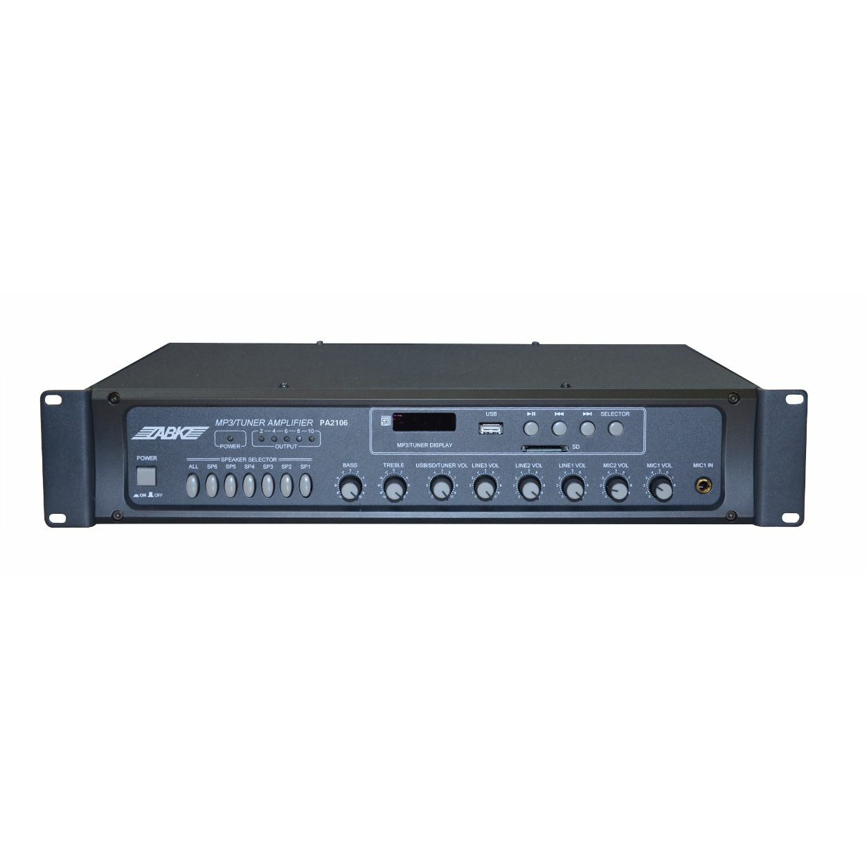 ABK PA-2106 микшер-усилитель на 6 нерегулируемых зон. Мощность модели составляет 60 Вт. Данная модель имеет MP3 плеер с USB/SD входами, FM антенна (87.5 - 108.0 МГц). ABK PA-2106 микшер-усилитель выполнен в черном цвете.