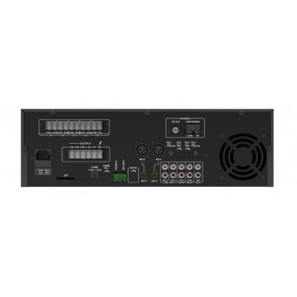 На 5-зонный микшер-усилитель можно подавать сигналы с двух аудиоисточников, 3 микрофонов и одного дополнительного входа Aux. Наличие специального входа для голосового микрофона 1, входа EMC для системы звукового оповещения и встроенной звуковой сигнализации расширяет спектр возможного применения данного усилителя при вполне бюджетной стоимости.
