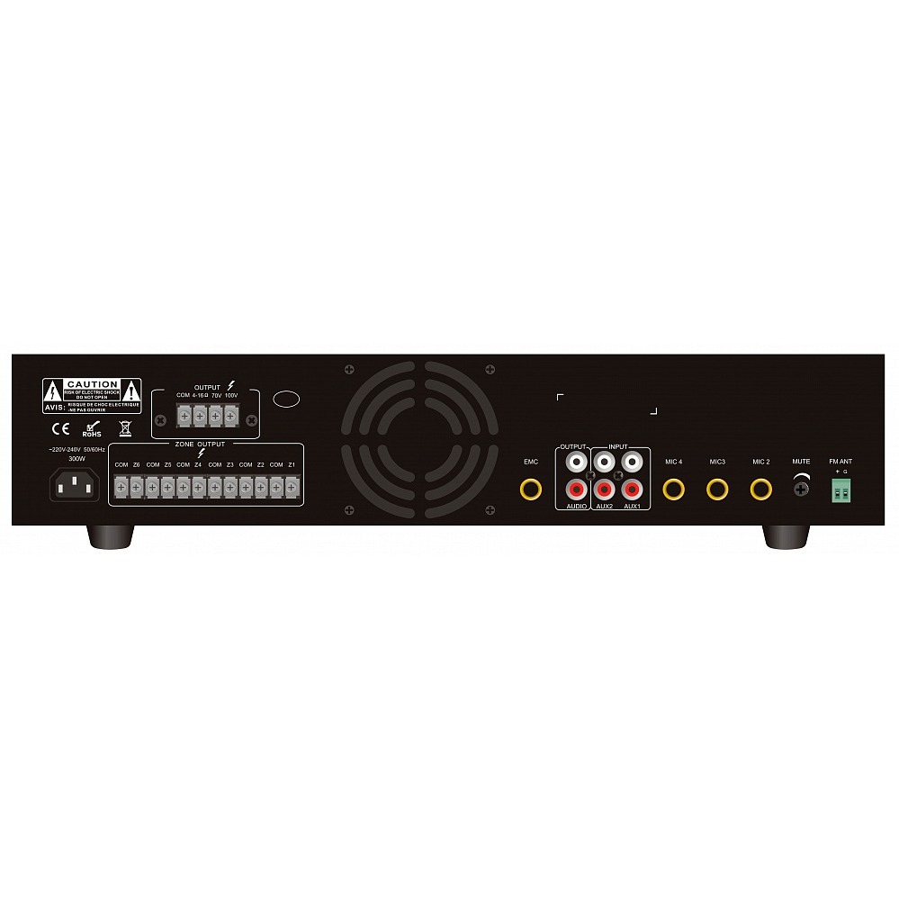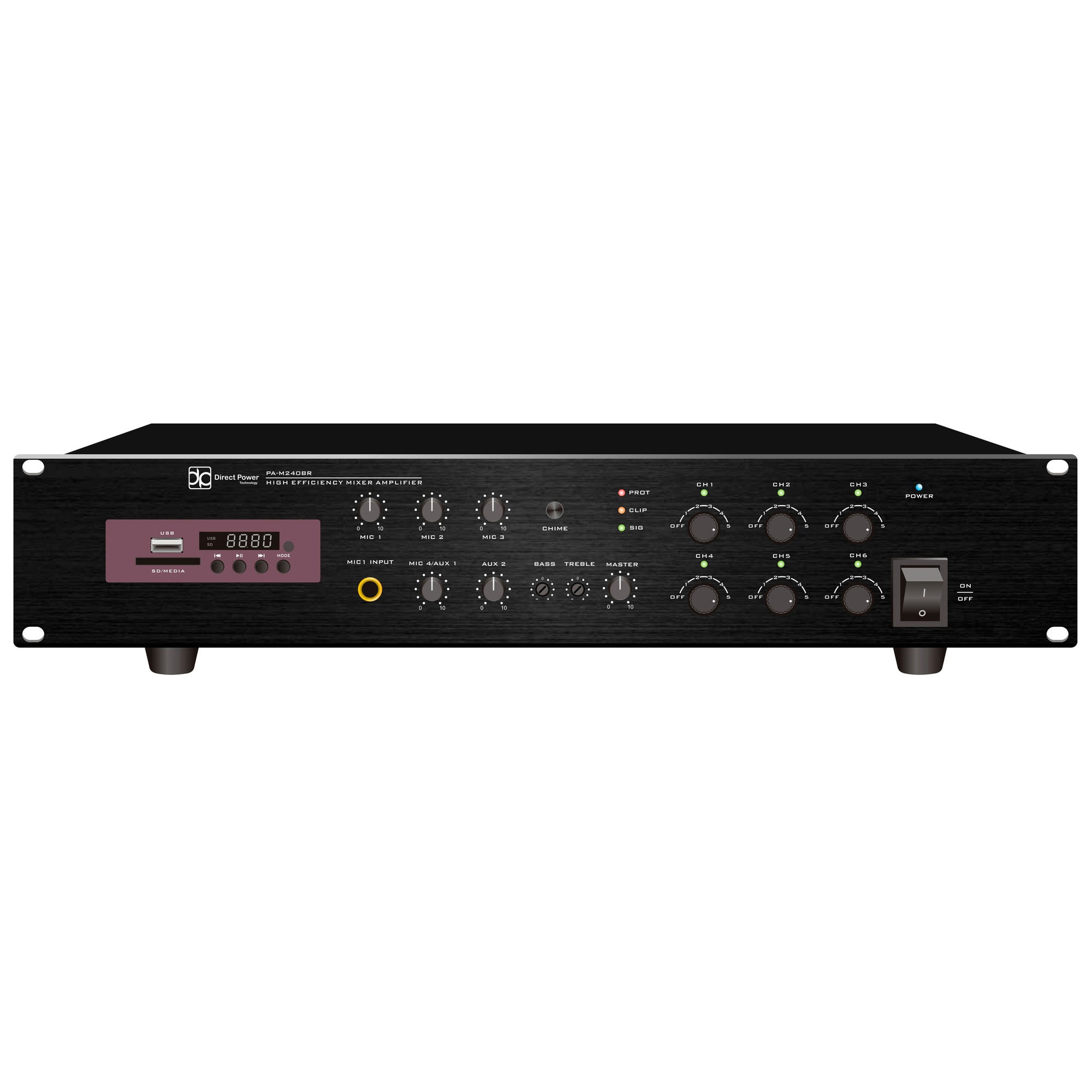 Трансляционный микшер-усилитель Direct Power Technology PA-M240BR это усилитель мощность 240 Вт, 6 зон с индивидуальной регулировкой мощности, MP3 проигрыватель с поддержкой USB носителей, Bluetooth и FM тюнер. Микшер-усилитель предназначен для монтажа в стандартную девятнадцати дюймовую стойку и занимает 2U. Оптимальное сочетание функций управления, надёжность и простота эксплуатации делают этот микшер-усилитель незаменимыми для трансляции звука в помещениях и на открытых пространствах. К микшер-усилителю Direct Power Technology PA-M240BR можно подключить до четырех источников микрофонного уровня, и до двух стереофонических источников сигнала с линейным уровнем (CD проигрыватель, звуковая карта ПК и т.п.). Входные каналы MIC1, MIC2, MIC3, MIC4 выпонены на разьемах типа jack. Линейный выход позволит передать сигнал на дополнительный усилитель или устройство записи. Удобно организовать систему оповещения поможет приоритет входных каналов: EMC> MIC1> MIC2 / MIC3 / MIC4 / AUX1 / AUX2 / MP3 Усилитель PA-M240BR предназначен для работы в линиях с напряжением 100В и 70В, а так же с акустическими система сопротивлением 4 -16 Ом. На передней панели Direct Power Technology PA-M240BR расположены раздельные регуляторы уровня громкости микрофонных и линейных каналов, раздельные регуляторы громкости выходного сигнала для шести зон, двухполосный эквалайзер, элементы управления медиа проигрывателем с цифровым дисплеем и индикаторы уровня сигналов. Трансляционный микшер-усилитель Direct Power Technology PA-M240BR широко используется для организации фонового озвучивания и оповещения в кафе, барах, ресторанах, торговых центрах, офисных зданиях, парках, скверах и набережных.