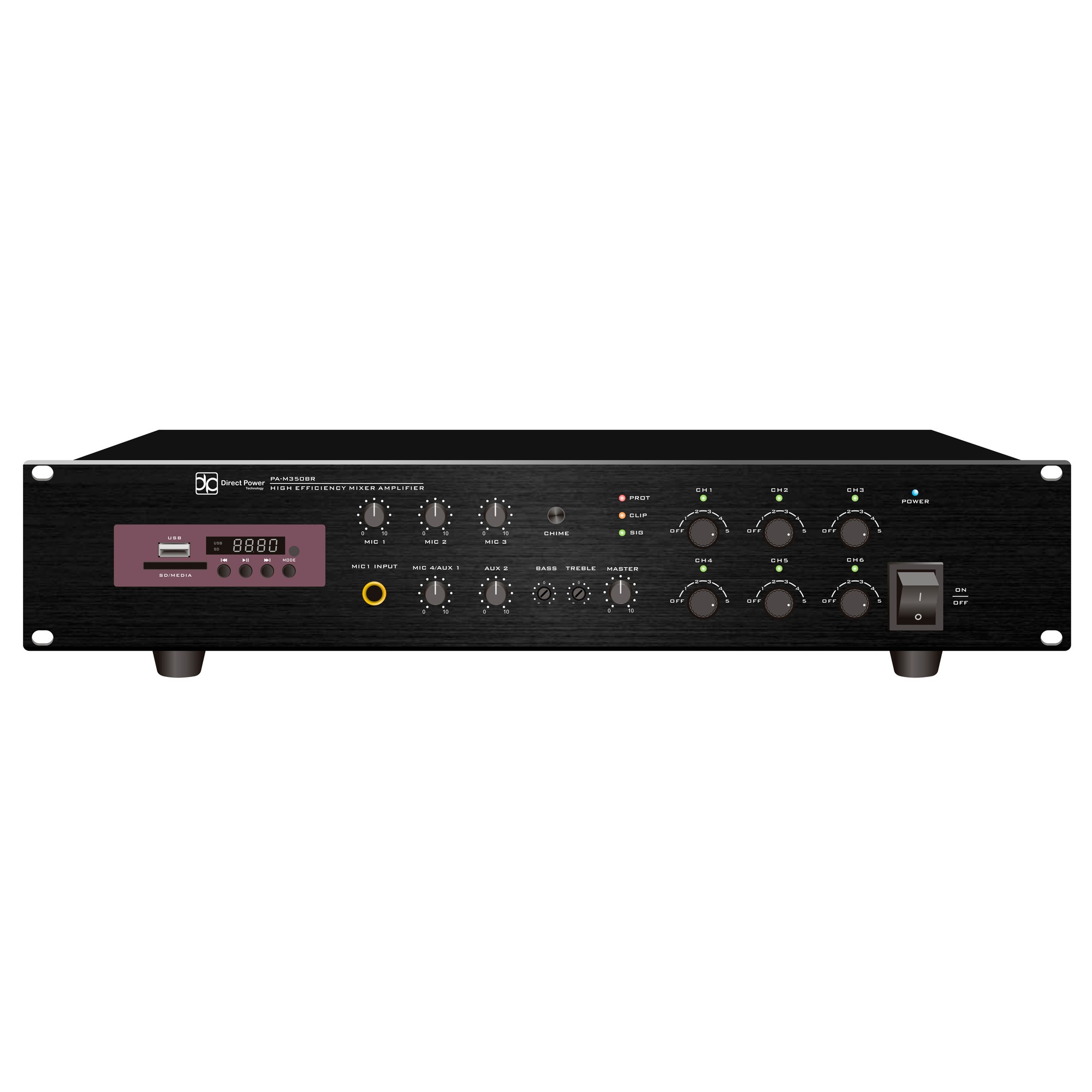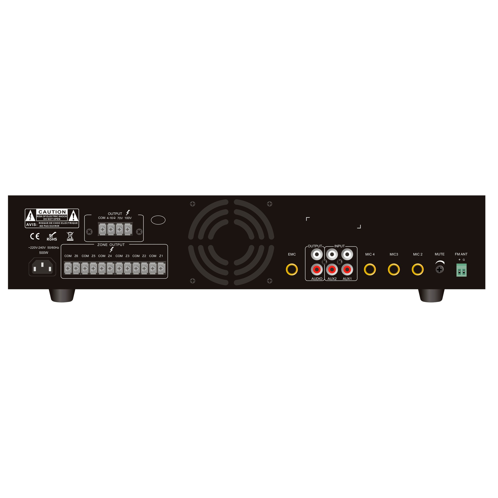 Трансляционный микшер-усилитель Direct Power Technology PA-M500BR это усилитель мощность 500 Вт, 6 зон с индивидуальной регулировкой мощности, MP3 проигрыватель с поддержкой USB носителей, Bluetooth и FM тюнер. Микшер-усилитель предназначен для монтажа в стандартную девятнадцати дюймовую стойку и занимает 2U. Оптимальное сочетание функций управления, надёжность и простота эксплуатации делают этот микшер-усилитель незаменимыми для трансляции звука в помещениях и на открытых пространствах. К микшер-усилителю Direct Power Technology PA-M500BR можно подключить до четырех источников микрофонного уровня, и до двух стереофонических источников сигнала с линейным уровнем (CD проигрыватель, звуковая карта ПК и т.п.). Входные каналы MIC1, MIC2, MIC3, MIC4 выпонены на разьемах типа jack. Линейный выход позволит передать сигнал на дополнительный усилитель или устройство записи. Удобно организовать систему оповещения поможет приоритет входных каналов: EMC> MIC1> MIC2 / MIC3 / MIC4 / AUX1 / AUX2 / MP3 Усилитель PA-M500BR предназначен для работы в линиях с напряжением 100В и 70В, а так же с акустическими система сопротивлением 4 -16 Ом. На передней панели Direct Power Technology PA-M500BR расположены раздельные регуляторы уровня громкости микрофонных и линейных каналов, раздельные регуляторы громкости выходного сигнала для шести зон, двухполосный эквалайзер, элементы управления медиа проигрывателем с цифровым дисплеем и индикаторы уровня сигналов. Трансляционный микшер-усилитель Direct Power Technology PA-M500BR широко используется для организации фонового озвучивания и оповещения в кафе, барах, ресторанах, торговых центрах, офисных зданиях, парках, скверах и набережных.