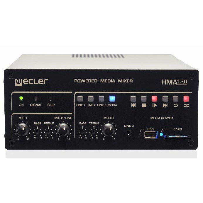 Ecler HMA 120 - микшер с автономным питанием и встроенным медиа плеером. Оснащен 5 аудиовходами и выходом с усилителем и изменяемым импедансом.