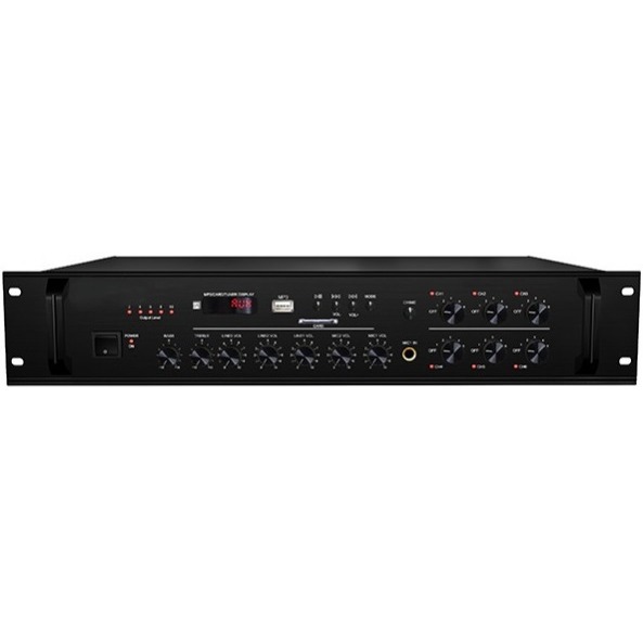 LAudio LAM6120U – это высококачественный трансляционный усилитель мощности, оборудованный выходами на громкоговорители 100 В и 4-16 Ом, 3 линейными входами, а также 4 микрофонными входами. При этом номинальный показатель мощности в модели составляет 120 Вт. Для каждого входа здесь предусматривается независимый регулятор низких и высоких частот. Помимо этого, для бесперебойной работы в микшер встроена уникальная система защиты от перегрева, коротких замыканий и перегрузок. Дополнительно в модель встроены MP3-плеер, радио приемник, слот для карт памяти и порт USB. Усилитель LAM6120U оборудован автоматической системой охлаждения, что делает его работу практически бесшумной. Корпус изготовлен из алюминиевого сплава высокой прочности. 6 зон в микшере обладают отдельными регуляторами громкости, а на каждом входе громкость регулируется индивидуально. Все эти параметры делают модель подходящей для установки в супермаркетах, школах и коммерческих учреждениях.