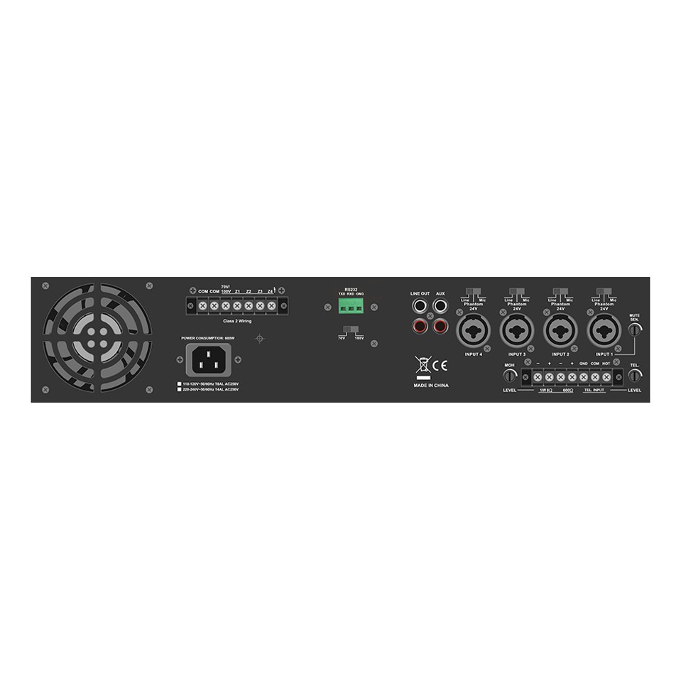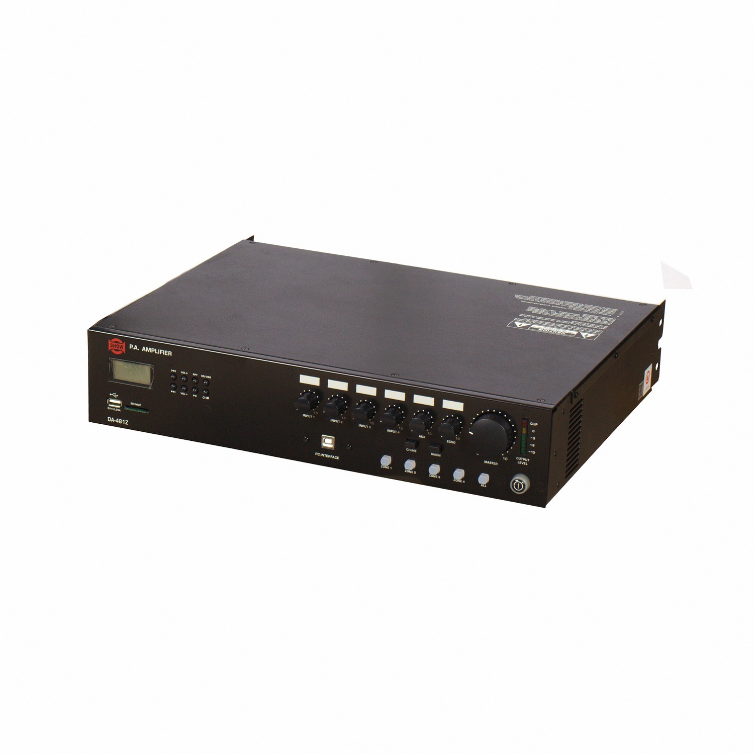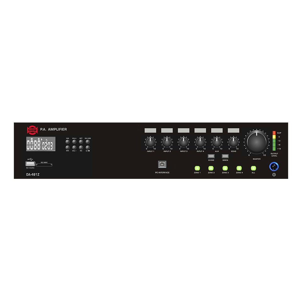 SHOW DA-481Z – компактный, экономичный и простой в использовании трансляционный усилитель, предназначенный для пейджинга и воспроизведения музыки в общественных помещениях и офисах, а также небольшого и среднего размера мероприятий. Созданный по технологии Class-D, он включает МР3 плеер, DSP функции, ПО управление и опциональную Dante сеть. 2U рэкового размера корпус оборудован четырьмя Mic/Line плюс двумя Aux входами с ручками регулировки громкости. 480 Вт выход разделен на 4 переключаемые зоны, а для оптимального качества звука функции DSP можно редактировать с помощью ПК. Также предусмотрен порт RS-232 и дополнительный выход управления, который пригодится в мониторинге для операторов, плюс есть телефонный вход для сторонних сообщений.