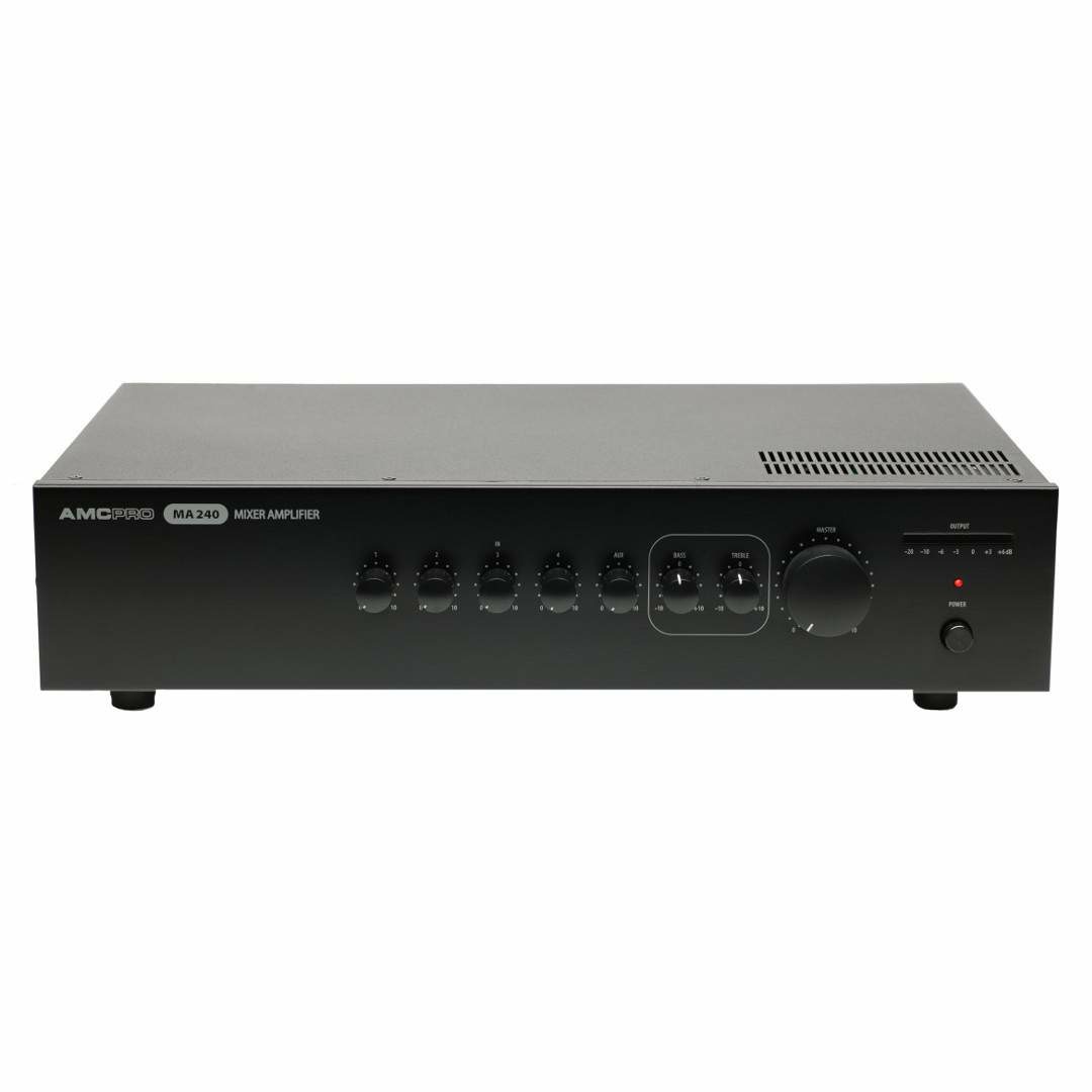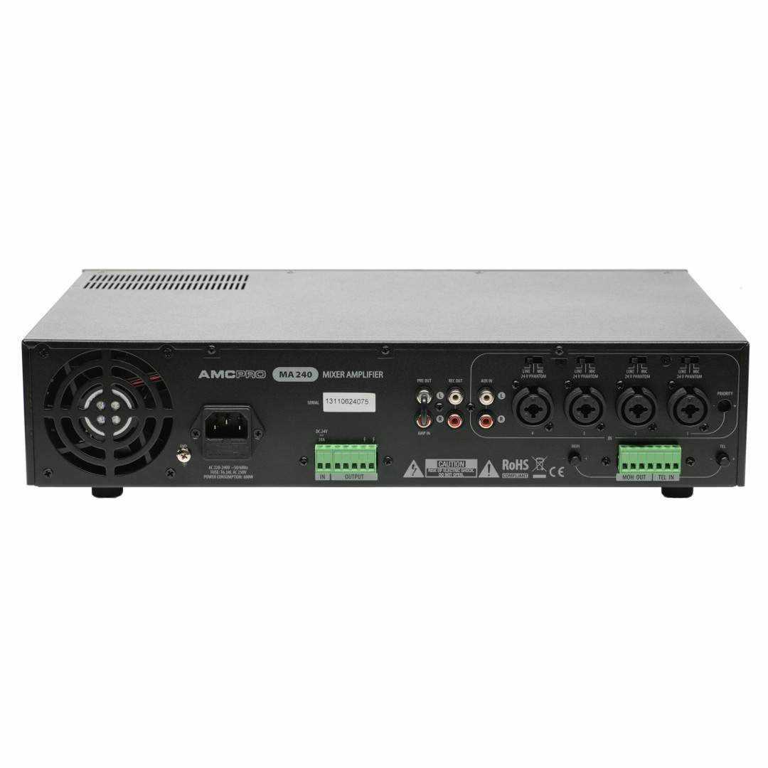 AMC MA 240 - отличный микшер-усилитель, который предназначен для использования в системах музыкальной трансляции, голосового и аварийного оповещения. Выходная мощность: 240 Вт.2 независимые зоны трансляции. 2 слота для подключения модулей CD/MP3 и TM3. Входы: 4 микрофонных, и 1 AUX вход, линейный стерео выход. Возможность подключения к телефонной сети. Индивидуальная регулировка уровня громкости каждого входного канала. «Голосовой приоритет» микрофонного входа 1 над другими сигналами. Фантомное питание для всех микрофонных. Две полосы эквализации (100 Гц, 10 кГц). Защита от перегрузки по напряжению, перегрева, короткого замыкания. Электропитание от сети переменного тока (220 В) или от источника постоянного тока (24 В).