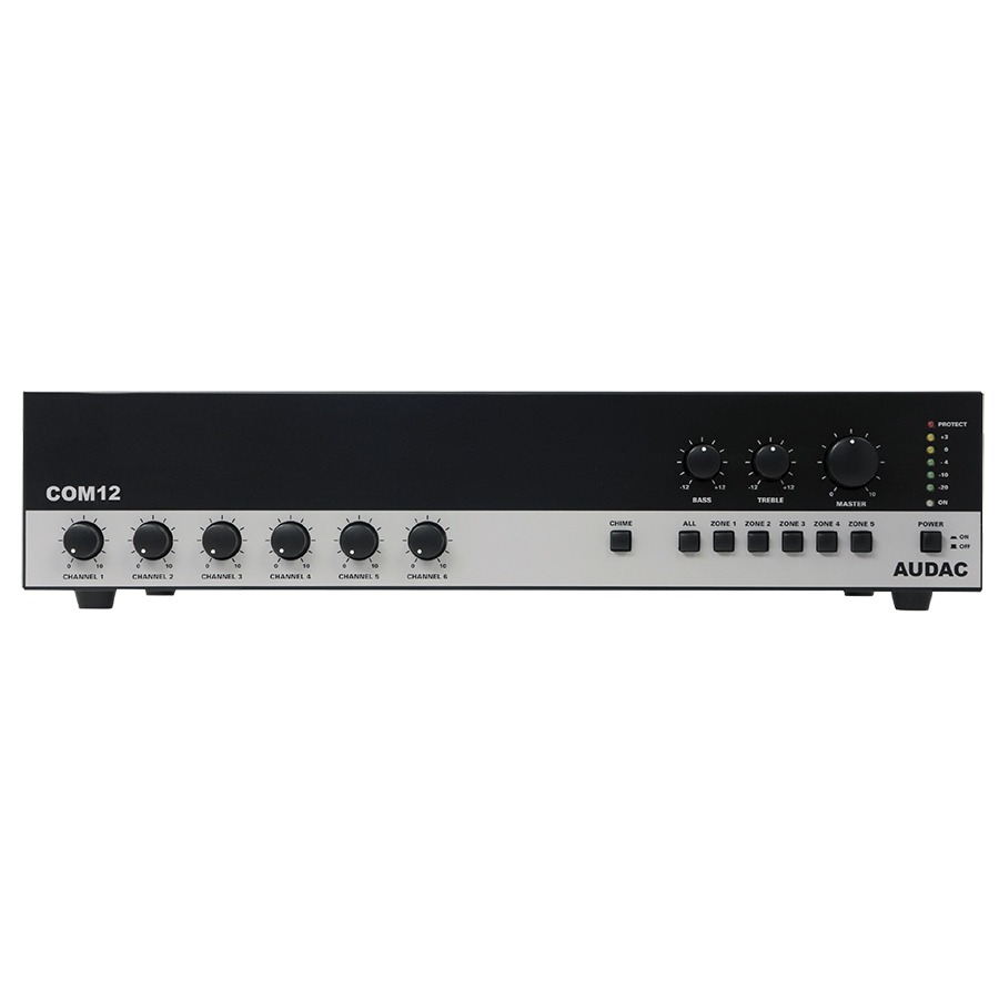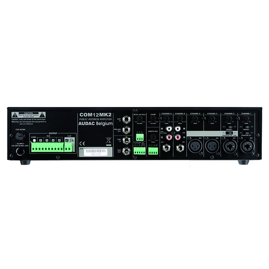 COM12MK2 – усилитель-микшер, предназначенный для систем громкой связи, построенных на базе трансляционной линии 100 В. Высокую степень универсальности устройству придает исчерпывающий коммутационный набор, позволяющий подключать большое количество разнообразных источников. В модели предусмотрено несколько входов с переключением между линейным и микрофонным уровнями чувствительности. Есть по два небалансных и балансных входа, два балансных входа с настройкой приоритета и фантомным питанием 15 В. Балансные входы реализованы на разъемах XLR и комбинированных разъемах XLR-TRS (2 шт), позволяющих подключать также 6,3 мм Jack. Имеется линейный выход Link для коммутации с другими устройствами (микшерами), устройство можно подключить к телефонной линии. В усилительной части предусмотрено пять выходов на трансляционную линию 100 В – можно подключить набор акустических систем суммарной мощностью 120 Вт RMS. Подключение осуществляется через клеммную колодку. Есть один выход для подключения низкоомной АС (4 Ом). Усилитель оборудован комплексной схемой защиты от короткого замыкания, постоянной составляющей, перегрева и перегрузки. Основные органы управления (выбор каналов, регуляторы уровня / тембра, регулятор громкости) и светодиодные индикаторы расположены на передней панели усилителя. Предусмотрен штатный монтаж в рэковую стойку 19″” с помощью комплектных адаптеров.