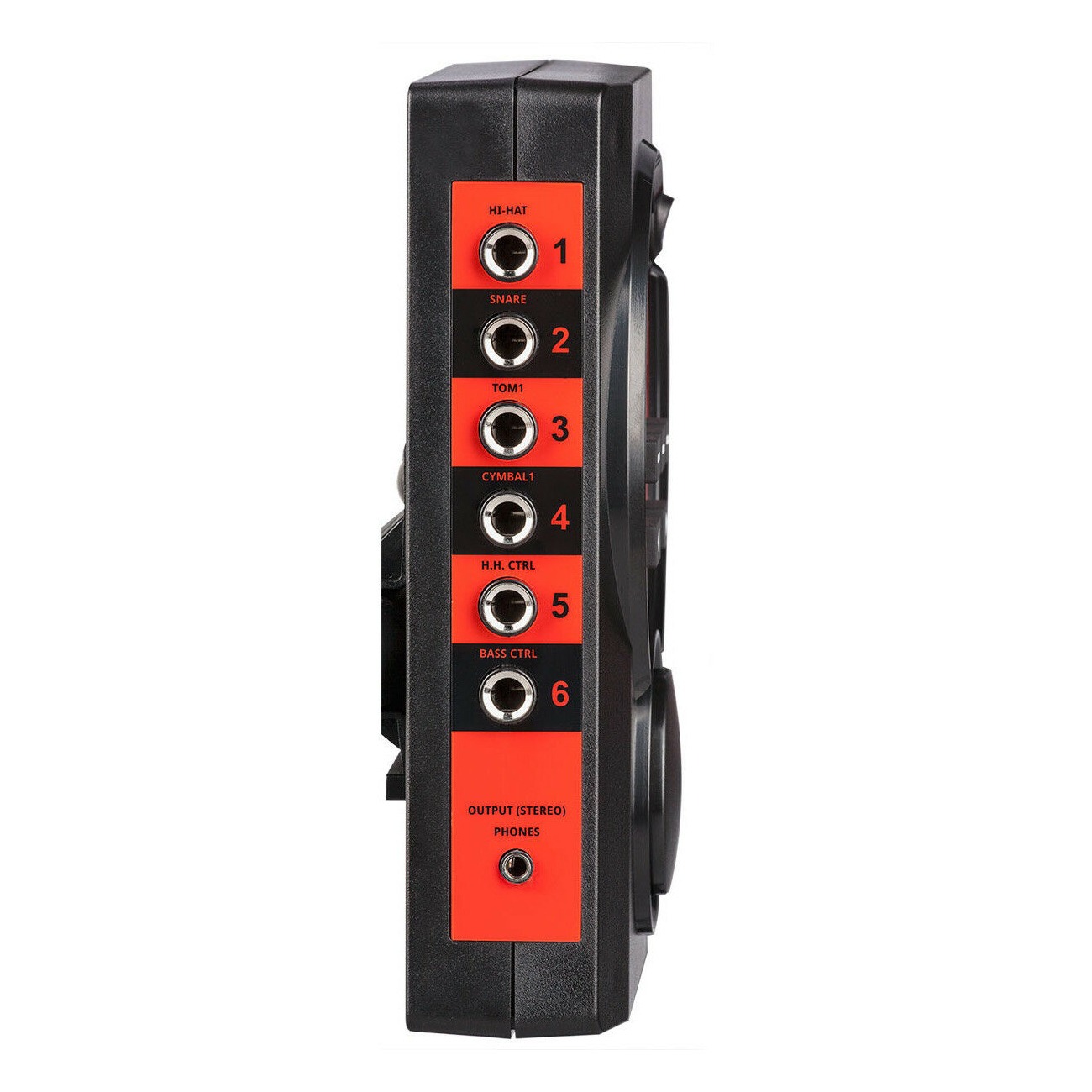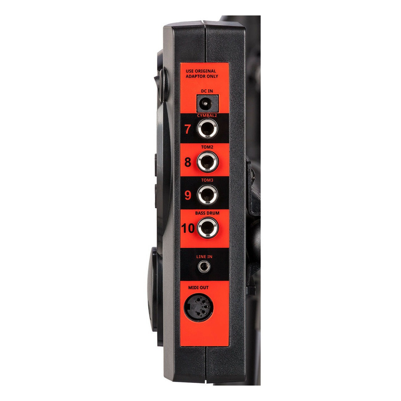 Корпус модуля изготовлен из пластика высокого качества и выполнен в черно-красном цвете. В модуле предусмотрено 32 пресета ударных установок, 168 разнообразных звуков, а также встроенный метроном и функция реверберации. Все 168 звуков разбиты на 11 категорий для наиболее удобной навигации. На лицевой панели устройства располагаются функциональные кнопки, небольшой дисплей, кнопка включения и колесо регулировки громкости. На боковых панелях модуля располагаются разъемы для коммутации, среди которых есть 10 разъемов Jack 6.3 мм для подключения пэдов и педалей, а также Midi разъем, линейный вход и выход для подключения наушников на разъемах mini Jack 3.5 мм.
