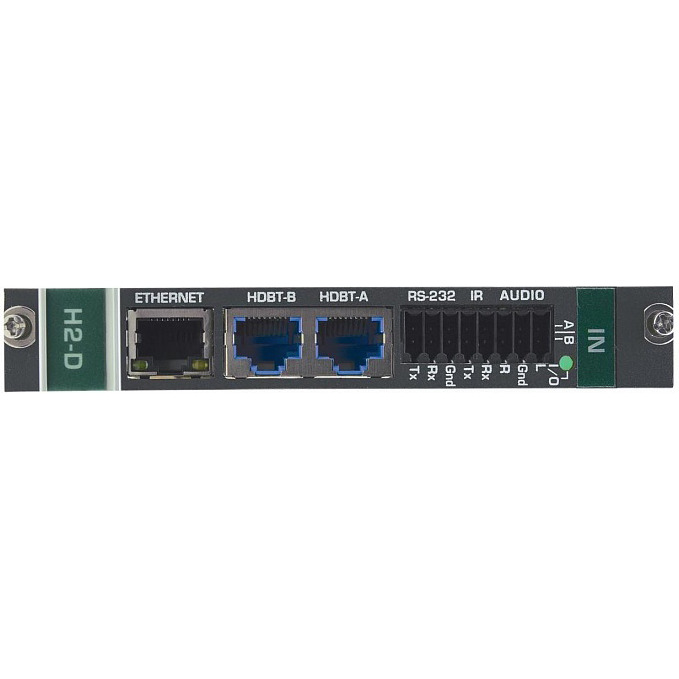 DTAXRD2-IN2-F34 – двухканальный входной модуль HDMI (по линии HDBaseT) c поддержкой HDR и разрешений до 4K@60 Гц (4:4:4), предназначенный для использования в составе шасси мультиформатного модульного матричного коммутатора VS-34FD. Модуль осуществляет прием двух сигналов HDBaseT с возможностью эмбедирования или деэмбедирования аналогового аудио (по выбору), а также прием двунаправленных сигналов RS-232, Ethernet и ИК, передаваемых по линии HDBaseT, и ввод их в модульное шасси.