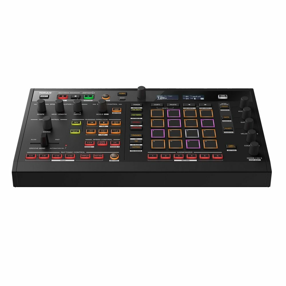 Проверьте Harmonizer, который позволяет выбрать основной тон и создать до шести аккордовых прогрессий. Кроме того, функция Groove Bend позволяет изменять время запуска в режиме реального времени с помощью встроенного ползунка. Еще одна продвинутая функция, Time Warp предназначена для быстрой фиксации идей в треке или выступлении без записи нескольких дублей. Pioneer DJ Toraiz Squid предлагает контроль над 16 х дорожками, каждая из которых содержит 64 х шаблона. Каждый шаблон может содержать до 64 шагов с полифонией по 8 х нот на шаг. На задней панели расположены MIDI In/Out/Thru (Out 2), порт USB, 2 х комплекта выходов CV /Gate, аналоговые I/O для синхронизации и DIN Sync 24 I/O. Специальное приложение SQUID Manager (для Mac /Windows) позволяет легко импортировать и экспортировать шаблоны последовательности и создавать резервные копии проектов. Pioneer DJ Toraiz SQUID поставляется с сетевым адаптером и шнуром питания.