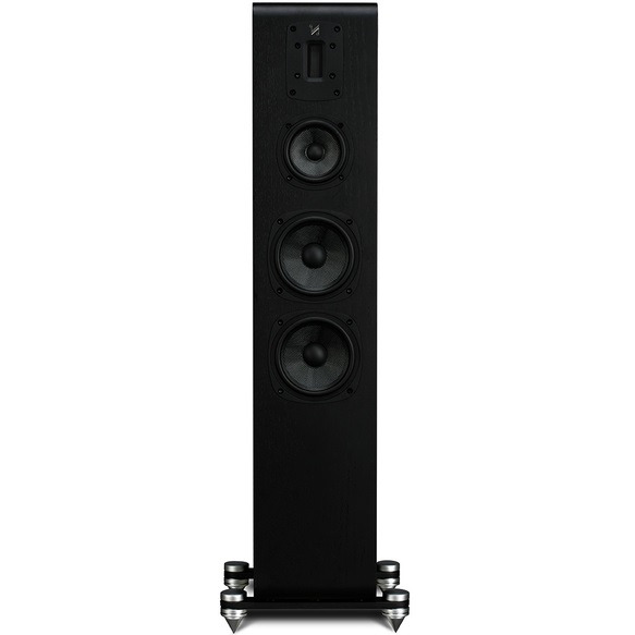 Quad S-5 оснащены фирменным ленточным твитером с размерами 12 х 45 мм, имеющим эффективную магнитную систему и прецизионную конструкцию. Так как данная модель обладает трехполосной конфигурацией, за воспроизведение средних частот здесь отвечает отельный динамик диаметром 125 мм с диффузором из тканного кевлара. Еще два более крупных излучателя с диафрагмами из такого же материала воспроизводят низкие частоты, диапазон которых в Quad S-5 начинается с 42 Гц по уроуню – 3 дБ. При этом нагрузкой низкочастотной секции в данной модели являются три пассивных пасовых радиатора, расположенных на задней панели. Такое решение имеет ряд преимуществ с точки зрения качества звука, и, кроме того, делает Quad S-5 менее требовательными к выбору места размещения в комнате прослушивания. Для придания колонкам большей устойчивости их опоры вынесены за пределы нижней панели. Для подключения к усилителю в акустике предусмотрен входной блок из двух пар высококлассных винтовых разъемов.