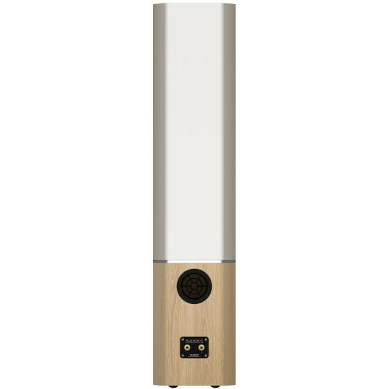 На основании задней стенки расположено крупное круглое отверстие фазоинвертора, а под ним находятся две винтовые клеммы для акустического кабеля. Вместо фронтальных грилей используются оригинальные тканевые чехлы, которые покрывают всю верхнюю часть — практично, но теряется часть впечатления от эффектной лицевой стороны. Для контакта с полом здесь не используются шипы — им производитель предпочел демпфирующие резонанс резиновые ножки.
