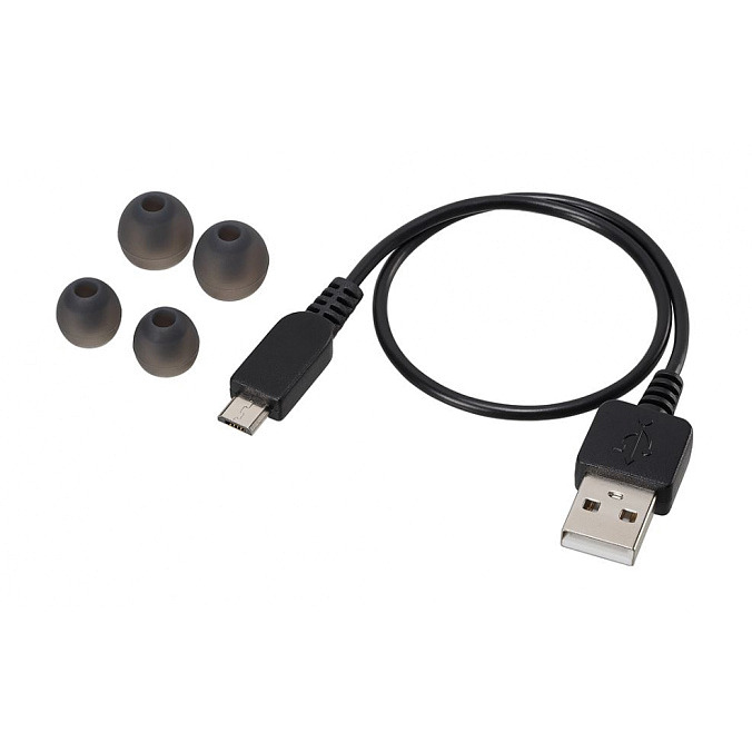 Комплектация: Кабель microUSB для зарядки (30 см), силиконовые амбушюры трёх размеров (S, M, L)