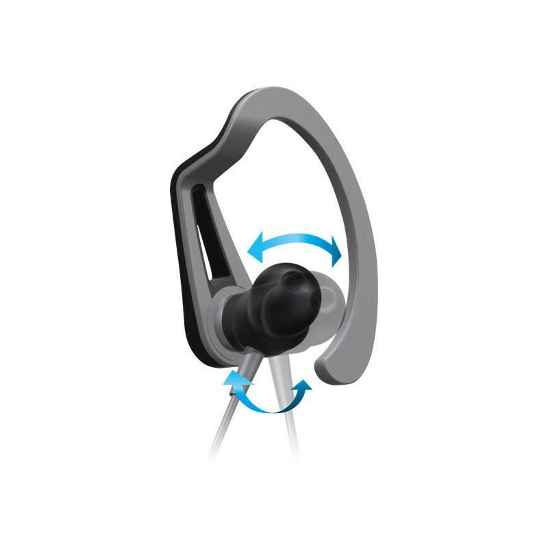 Модель отличается наличием специальной шарнирной конструкции, которая надежно удерживает наушник в ухе даже при резких движениях при занятия спортом. Шарнир обеспечивает максимально комфортное положение устройства, не сдавливая ушной канал. К тому же, устройство оснащено крючками, способствующим более надежной фиксации. Если вы не собираетесь активно двигаться при прослушивании музыки, то вы можете отсоединить крючки, тогда наушники по внешнему виду станут похожи на классические модели. На проводе расположен компактный пульт, при помощи которого вы сможете оперативно отвечать на входящие звонки.