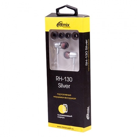 Ritmix RH-130 - стильные портативные наушники в легком алюминиевом корпусе. Мягкие вкладыши разных размеров надежно фиксируют наушники в ушах и обеспечивают дополнительную защиту от внешних шумов. Благодаря стандартному 3.5 мм штекеру наушники совместимы с большинством аудиоустройств.
