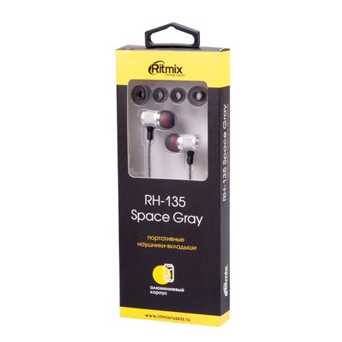 Ritmix RH-135 - стильные портативные наушники в алюминиевом корпусе. Прочный и легкий корпус способствует комфортному использованию наушников, и предохраняет их от повреждений. Мягкие вкладыши разных размеров надежно фиксируют наушники в ушах и обеспечивают дополнительную защиту от внешних шумов. Благодаря стандартному 3.5 мм штекеру наушники совместимы с большинством аудиоустройств.